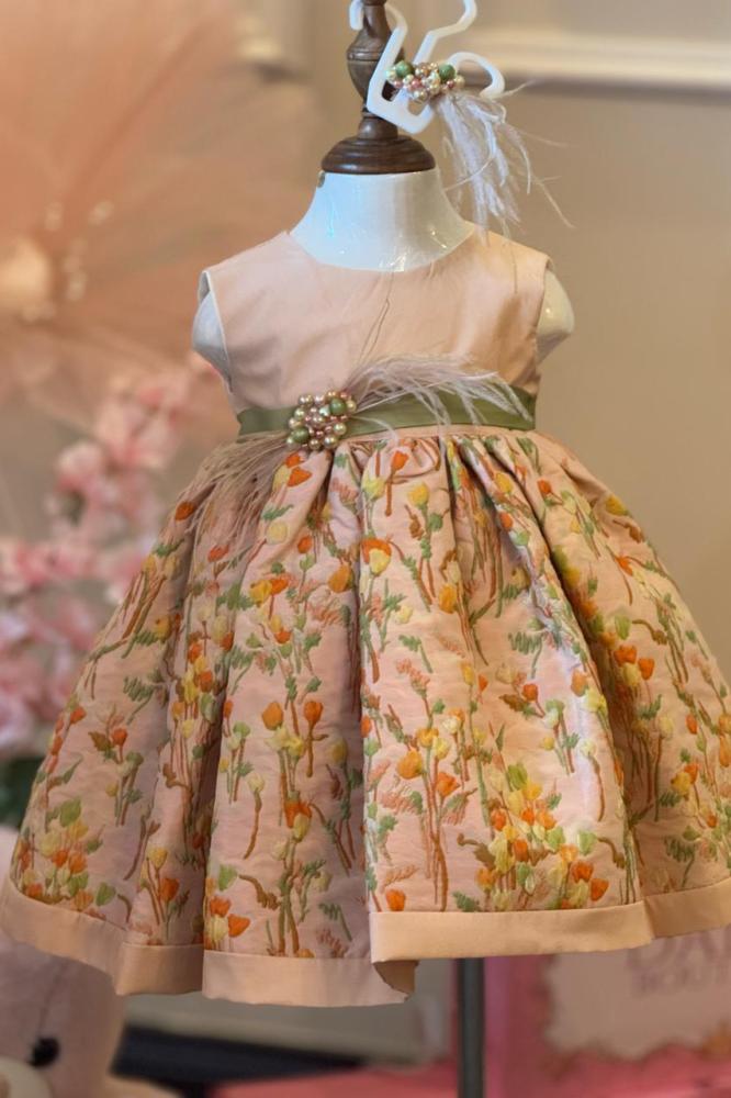 ٢٠٥فستان براند تركي من قماش تفتة واقف وجيبون مبطن مريح في اللبس من ألوان جذابة " البيج والزيتي والاورنج الخفيف" مع إكسسوار من اللولو على خصر الفستان ومشبك الشعر يلبس من عمر الأشهر ل لعمر السنتين 👍.