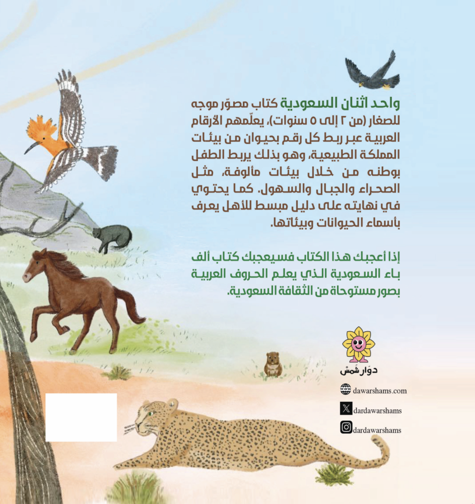 واحد اثنان السعودية كتاب مصوّر موجه للصغار (من ٢ إلى ٥ سنوات)٫ يعلّمهم الأرقام العربية عبر ربط كل رقم بحيوان من بيئات المملكة الطبيعية٫ وهو بذلك يربط الطفل بوطنه من خلال بيئات مألوفة، مثل الصحراء والجبال والسهول. كما يحتوي في نهايته على دليل مبسط للأهل يعرف بأسماء الحيوانات وبيئاتها.