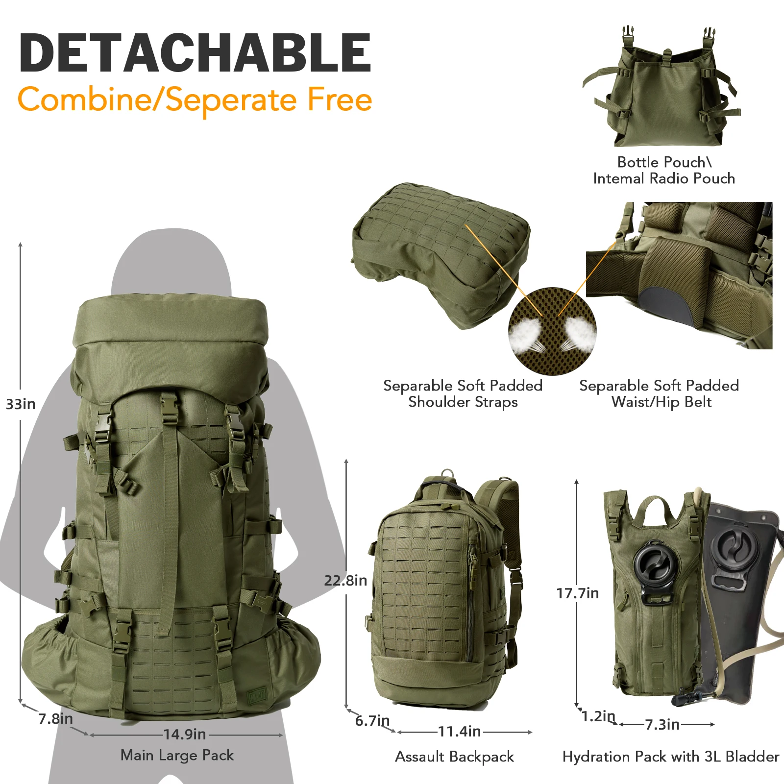 13 جزءًا قابلة للفصل: 1* عبوة رئيسية كبيرة، 1* عبوة هجومية، 1* عبوة ترطيب مع 1*مرحل.1 × أحزمة كتف مبطنة، 1 × حزام خصر/ورك مبطن، 1 × حقيبة داخلية، 1 × حافظة معرف، 4 × مشبك مولي، 1 × علبة زجاجات.