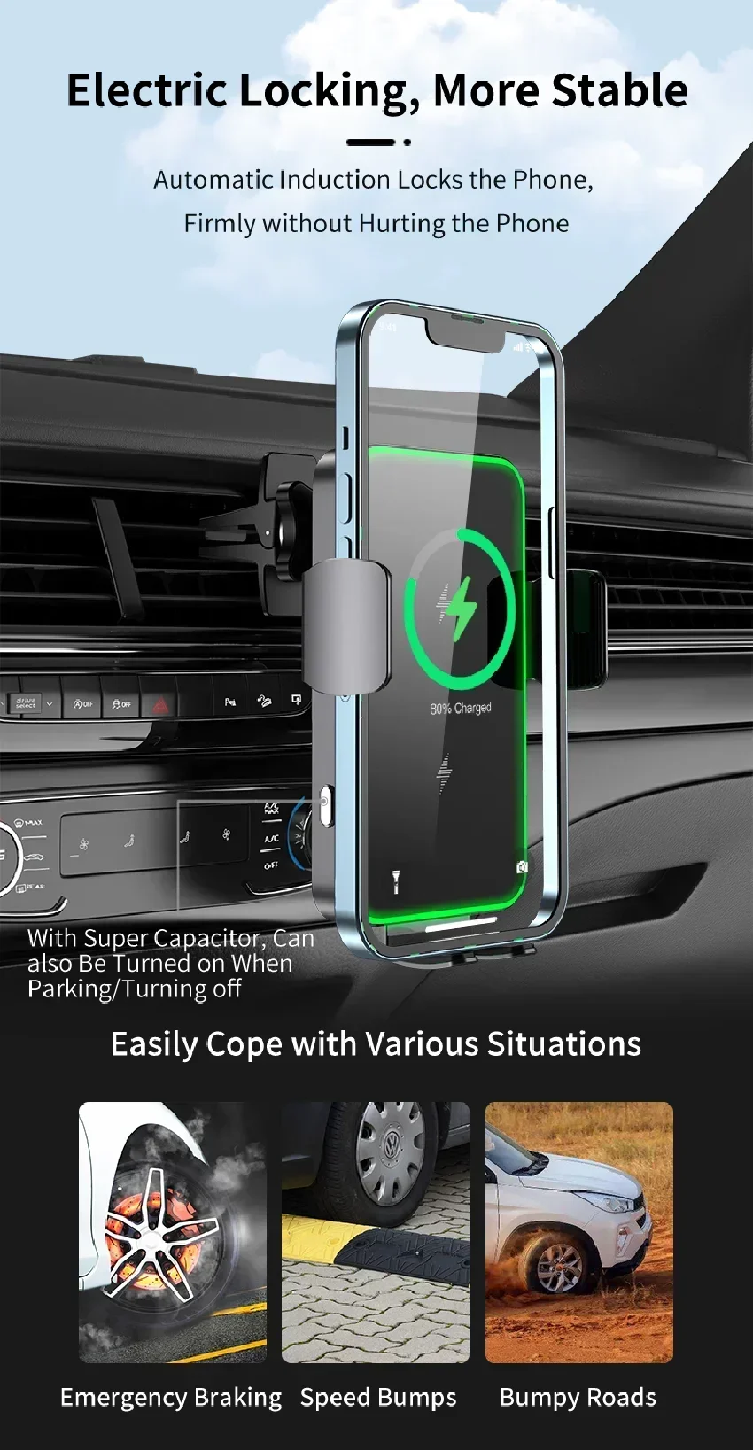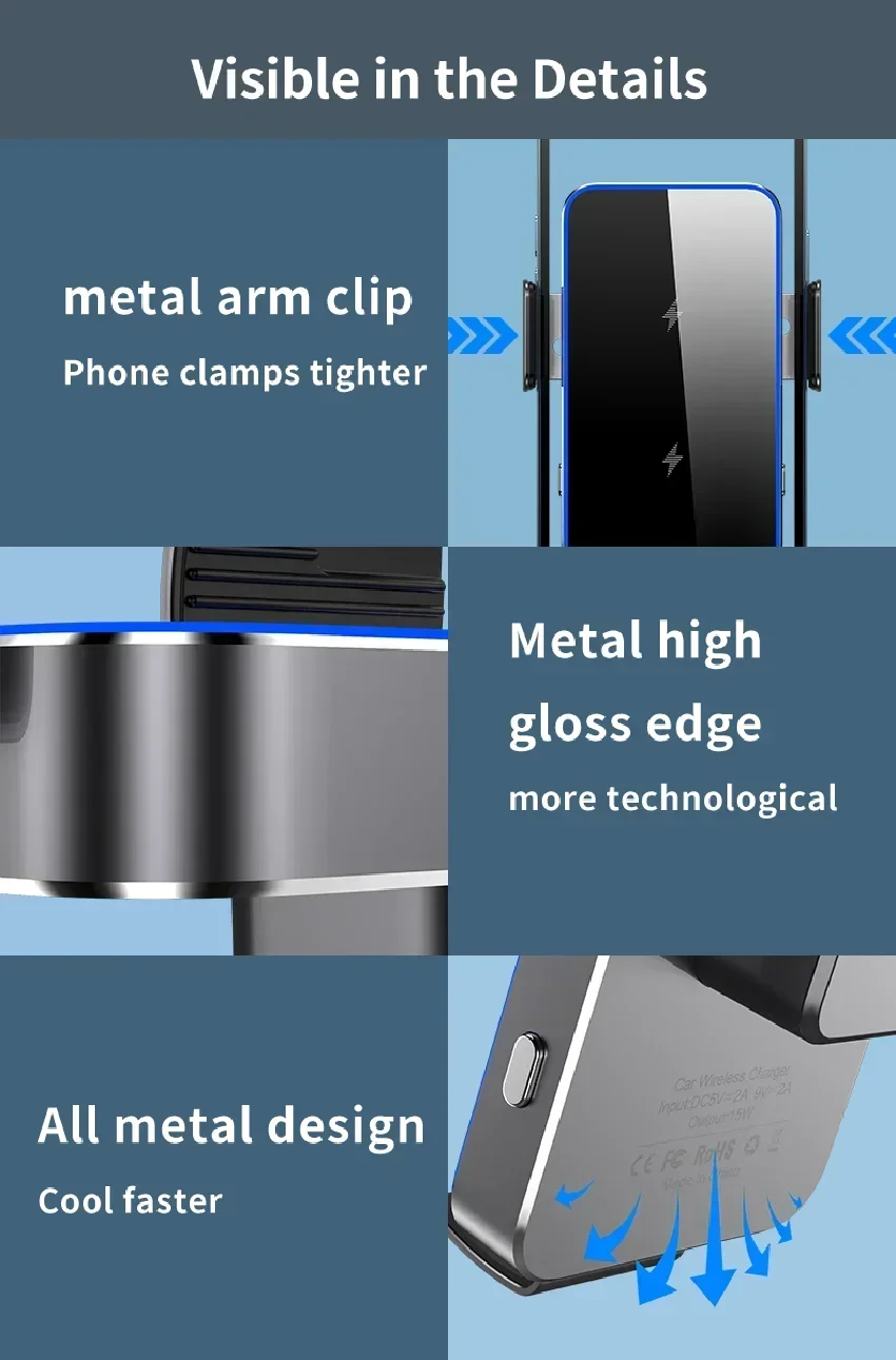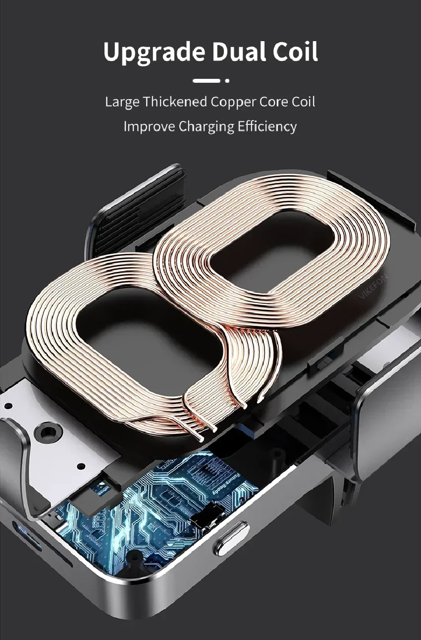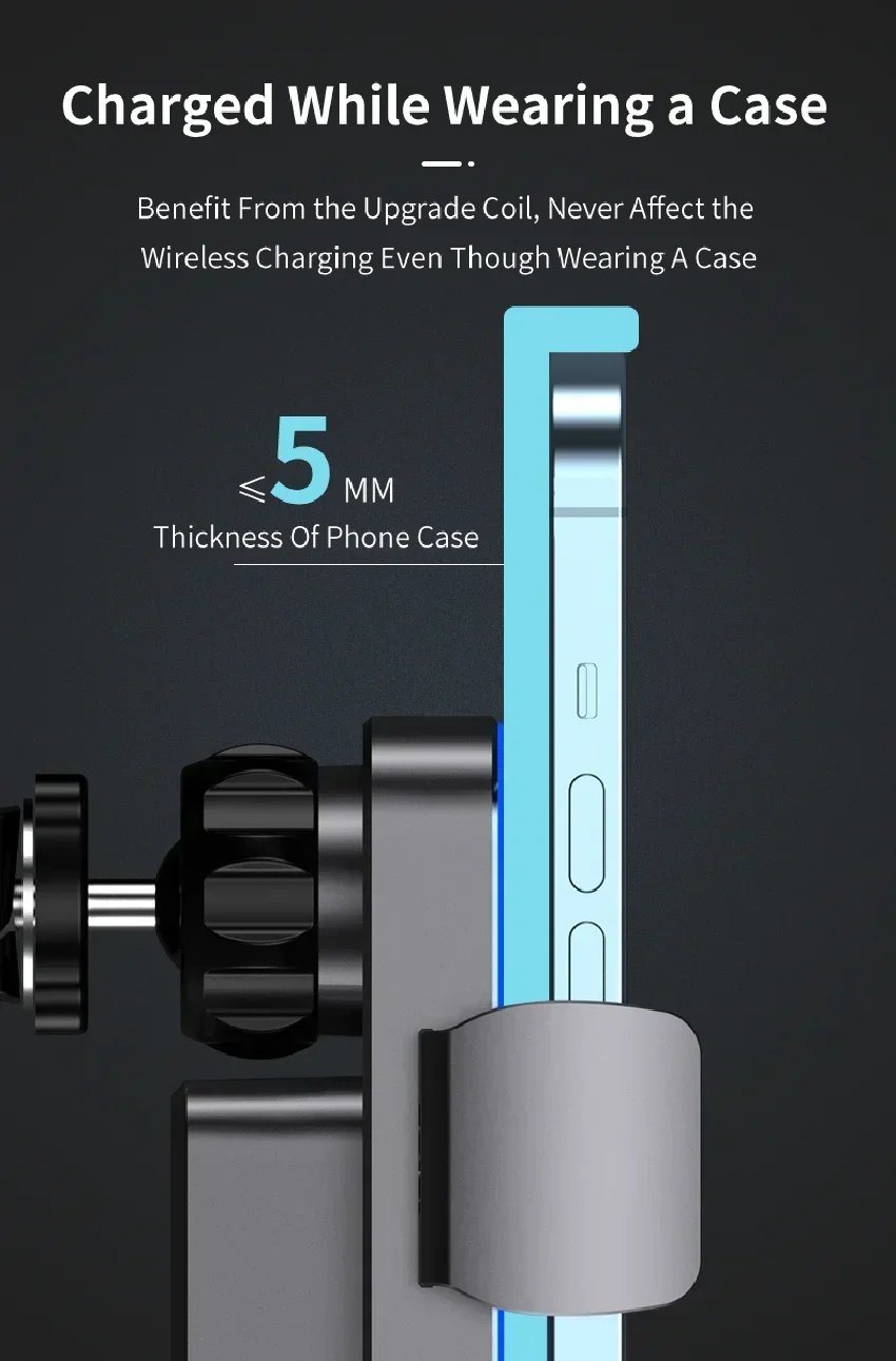يحتوي حامل شاحن السيارة اللاسلكي على لفائف مزدوجة مدمجة ، مقارنة بالشواحن أحادية الملف ، يحتوي الشاحن اللاسلكي ثنائي الملف على ضعف منطقة الشحن ، وكفاءة شحن أعلى ، التي يمكن أن توفر شحن سريع ثابت لهاتفك المحمول.