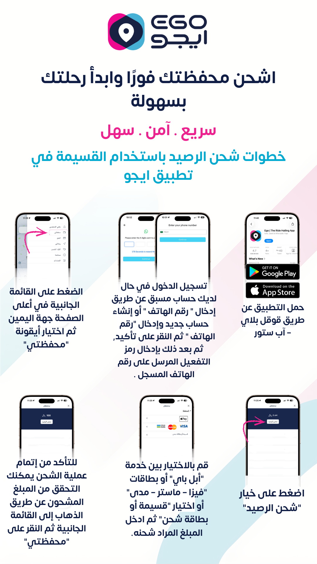الحل الأسرع والأكثر توفيراً للحصول على رصيد فوري في تطبيق إيجو. تمنحك هذه البطاقة رصيداً بقيمة 100 ريال لتستخدمها في كافة مشاويرك اليومية بكل راحة وأمان.