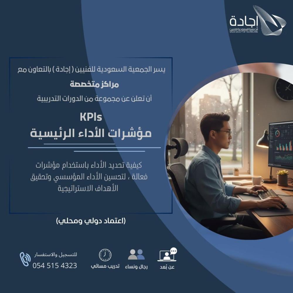 هل ترغب في تحسين أداء مؤسستك وتحقيق أهدافك بشكل أكثر فعالية؟ دورة مؤشرات قياس الأداء (KPIs) هي الحل الأمثل لتحقيق هذا الهدف!