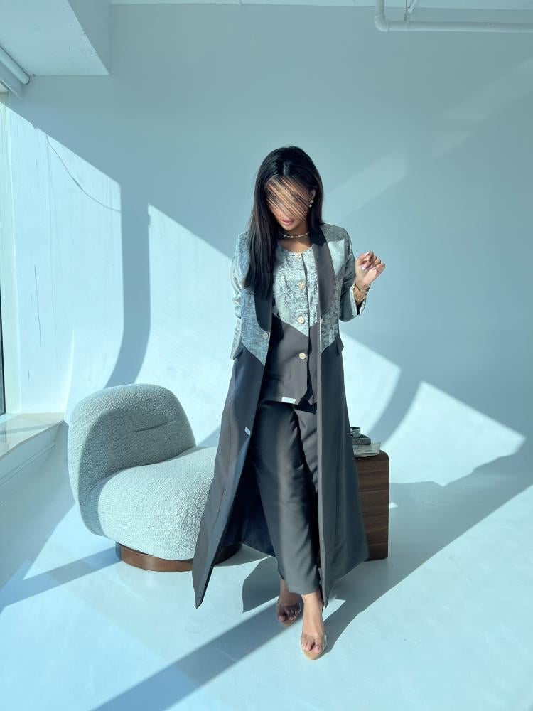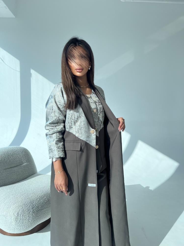طقم مكوّن من 3 قطع: عباية بليزر بلون رمادي أنيق، مبطنة ببطانة مريحة لتوفير راحة مثالية، مع بنطلون وبلوزة نص كت رسمية من قماش كريب تايلندي ناعم. تصميم رسمي متكامل يمنحك إطلالة راقية وعصرية.