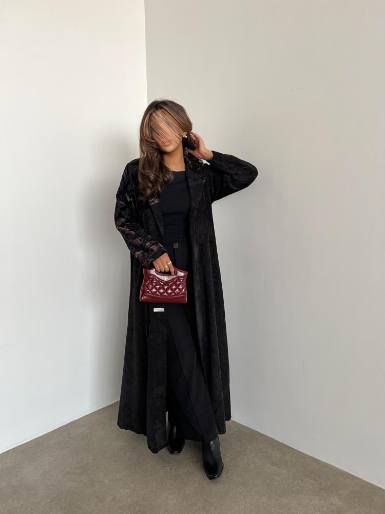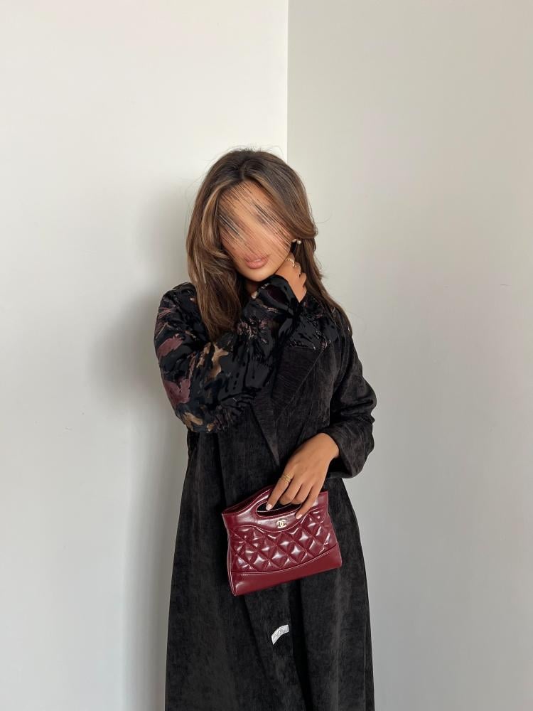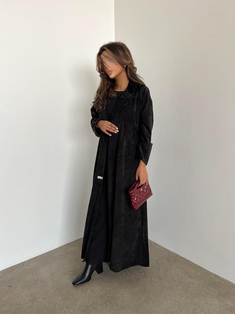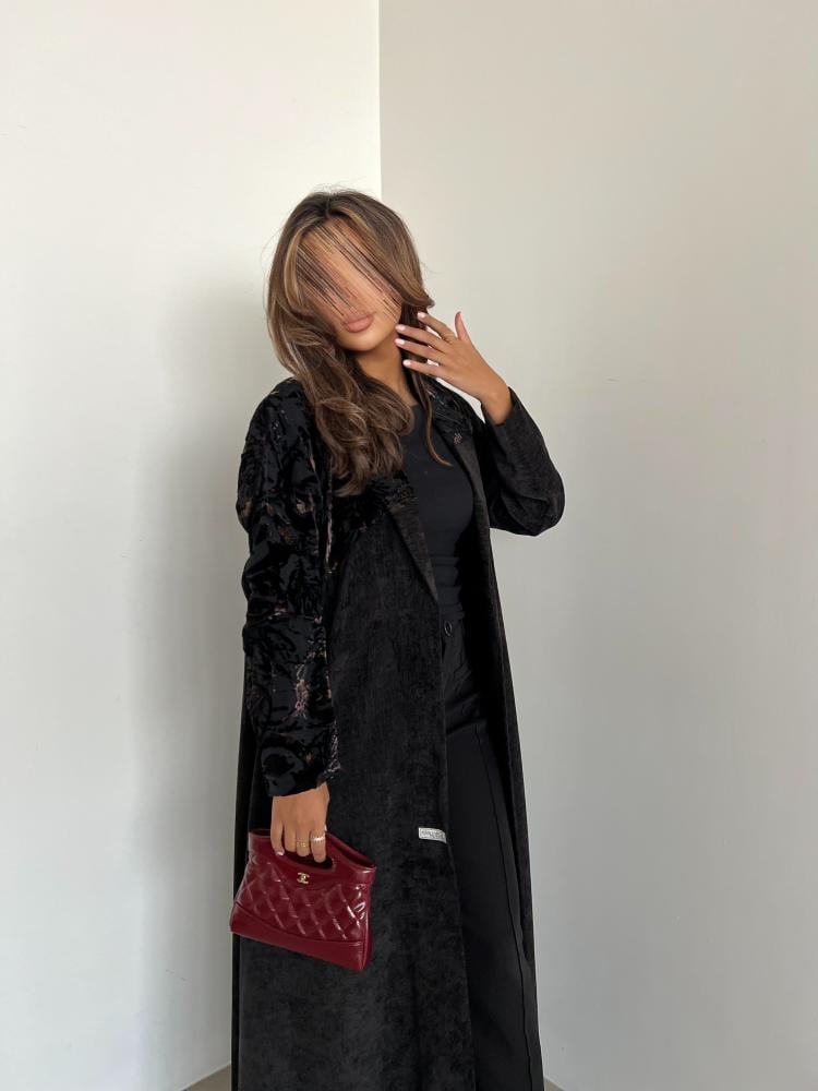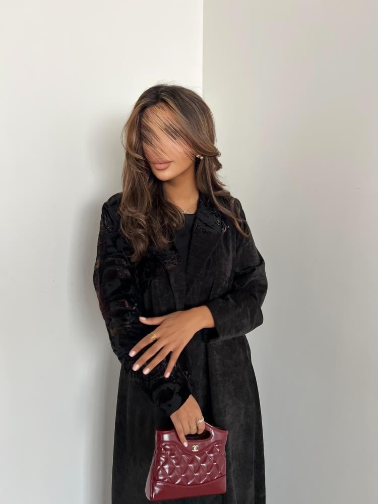 التفاصيل:عباية بقماش شتوي ناعم ،مصمم بقصة بليزر مع اضافة شيفون راقي