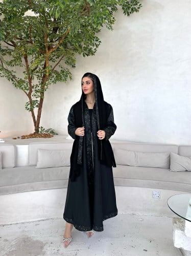 التفاصيل:عباية عملية بقصة نص كلوش مصممة بقماش مس كريب اندونسي وبالاضافة لها تشيكلة مميزة من تصميمنا