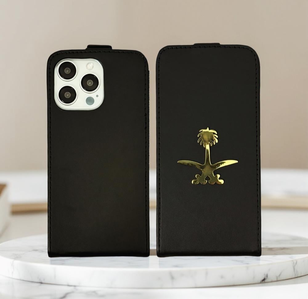 كڤر السعودية جلد اسود بغطاء يحمي الشاشة ، لوقو معدني فخم✨