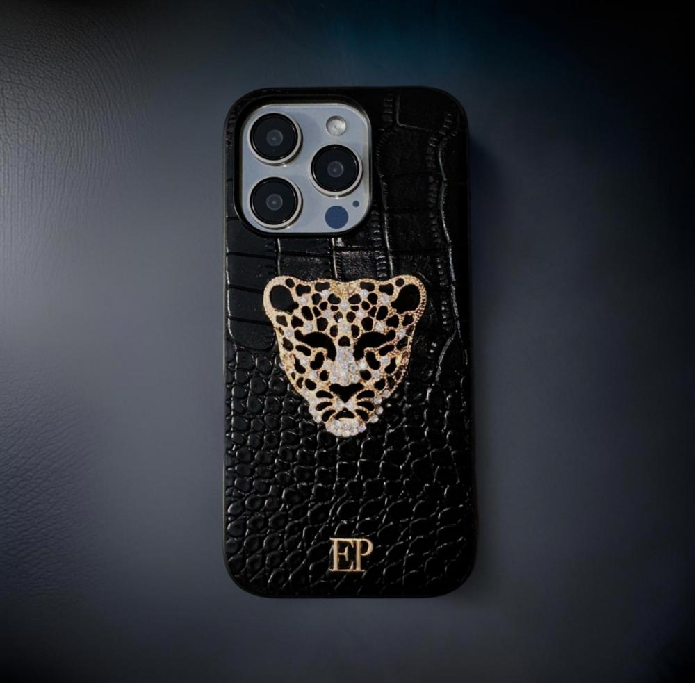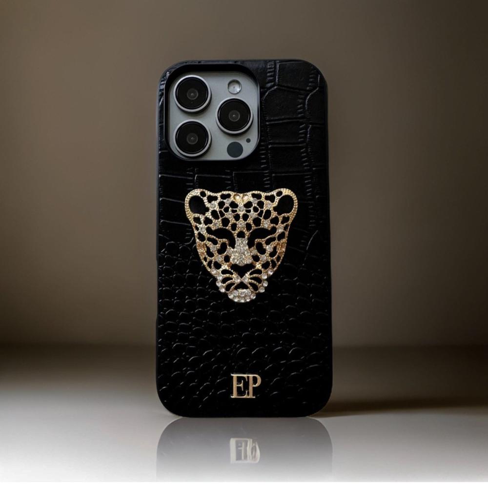 كڤر حماية جلد كروكودايل اسود جودة عالية 🖤مع كرستال ذهبي الفهد بلمعة فخمة ، انتاج خاص EP 🐊🐆