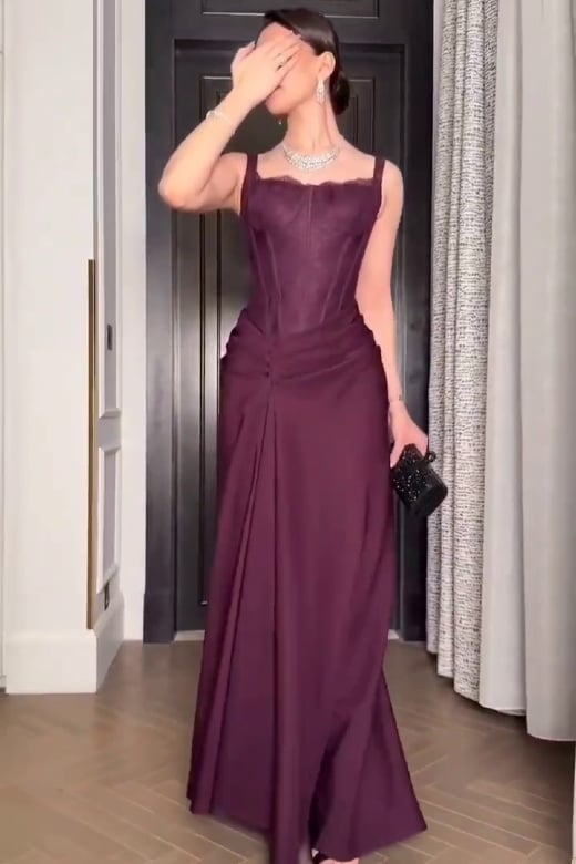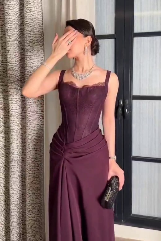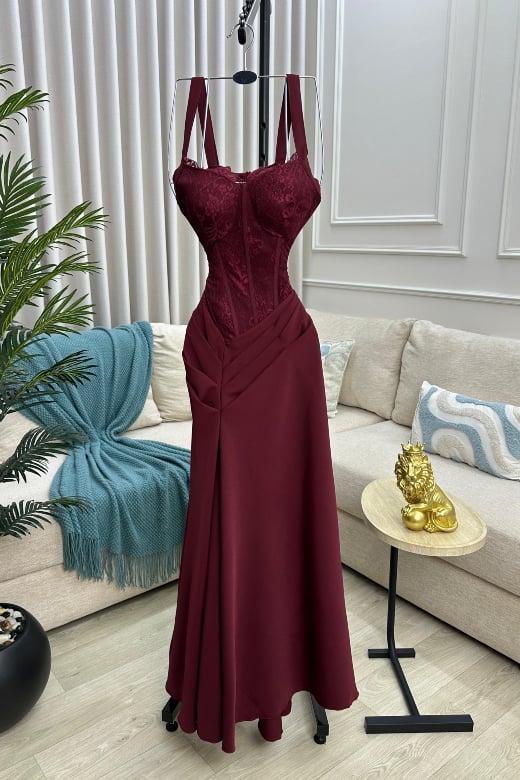 فستان سهرة عنابي بتصميم أنيق وتفاصيل دانتيل - موديل نعومة المساء