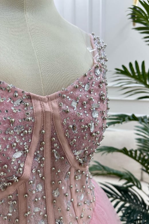 فستان خطوبة وردي بقصة أميرات وتطريز فاخر - موديل حكاية خيالية