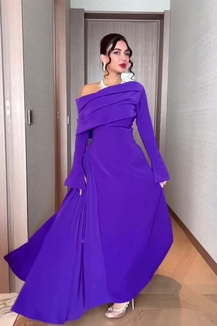 فستان سهرة موف بأكتاف مكشوفة وفتحة جانبية - موديل أمسية هادئة