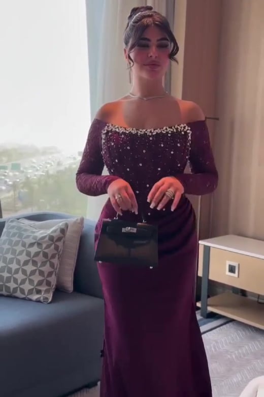 تكمن فخامة التصميم في الأكمام الطويلة والمنفصلة، والمصنوعة من الدانتيل الشفاف والمغطاة بالكامل بتطريز يدوي فخم بالكريستال اللامع، مما يضيف لمسة من البريق والرقي على إطلالتك.