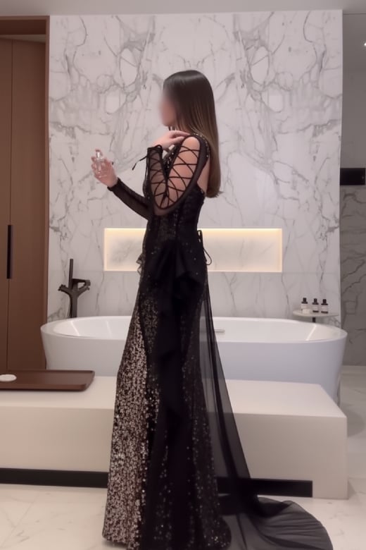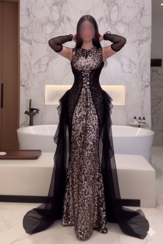 الفستان مغطى بالكامل بالترتر الأصلي درجة أولى، والذي تم تطريزه بعناية على قماش الجزار ليمنحكِ مظهراً متلألئاً وفاخراً مع كل حركة. تأتي قصة الفستان على شكل حورية البحر (Mermaid) لتحتضن القوام وتبرز جماله، مع صدرية بدون حمالات تضفي لمسة من الجاذبية.