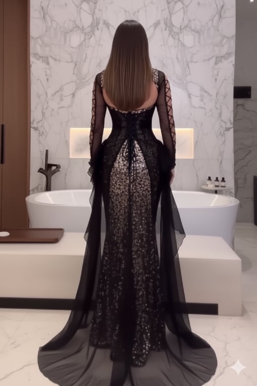 فستان سهرة أسود لامع بتصميم جذاب - موديل نجمة متلألئة