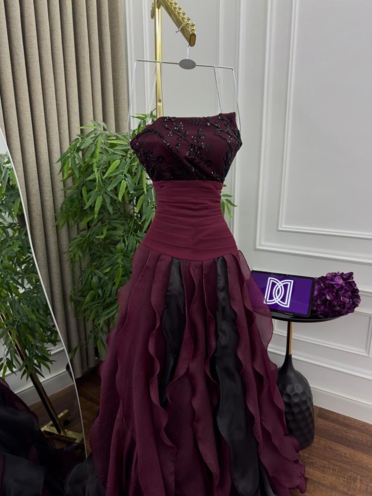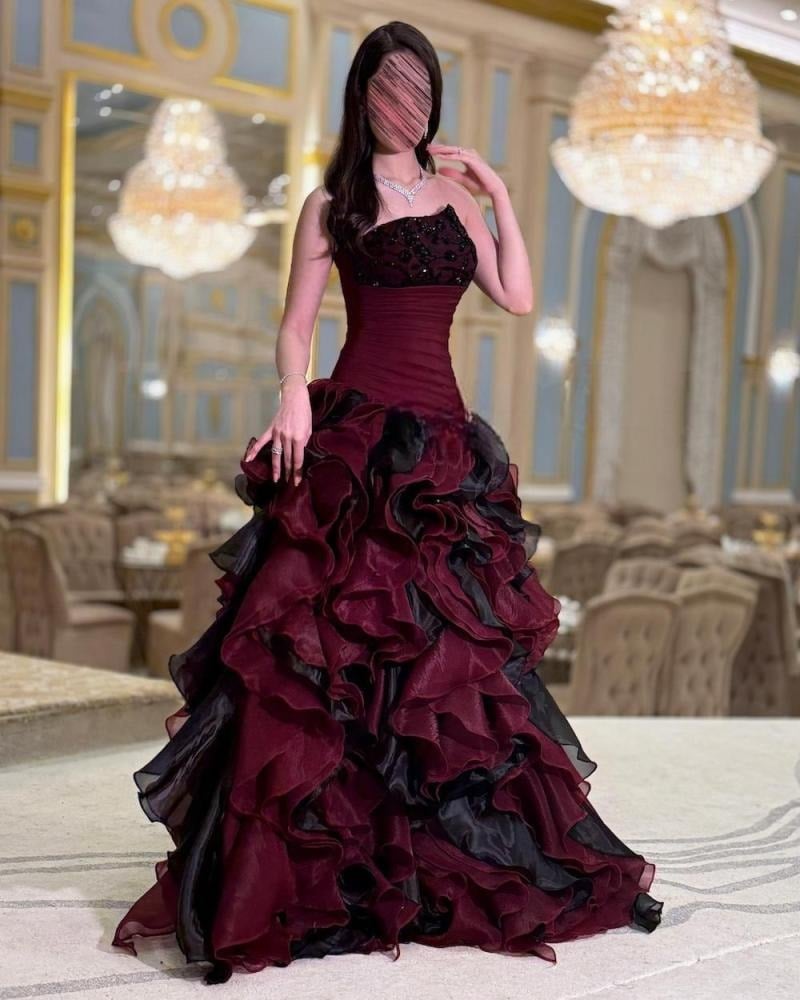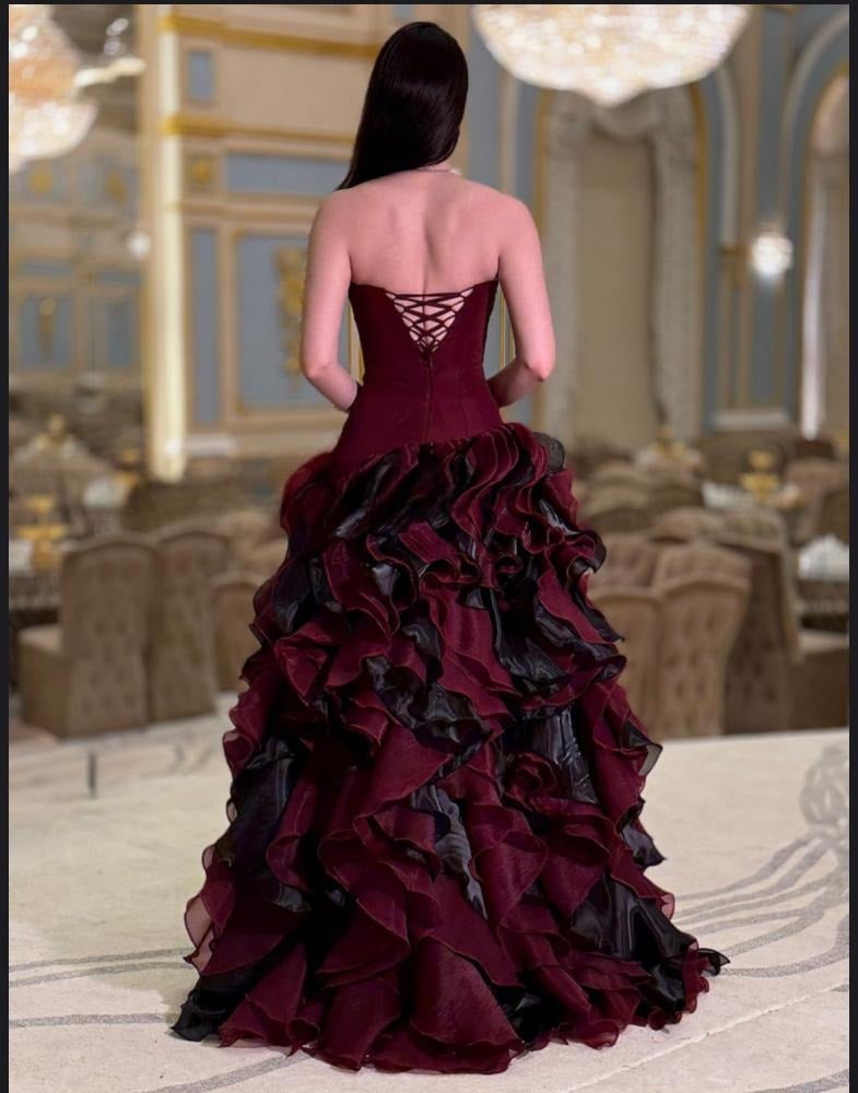 تنفجر التنورة بطبقات متتالية وكثيفة من قماش الأورجنزا اللامع باللونين العنابي الغني والأسود الملكي، مما يخلق حجماً هائلاً وحركة مسرحية مع كل خطوة. وفي الأعلى، يبرز صدر الفستان بقصته الضيقة والمحددة للقوام، والمزين بتطريز راقٍ يضيف لمسة من البريق الفاخر الذي يتناقض بشكل رائع مع ضخامة التنورة.