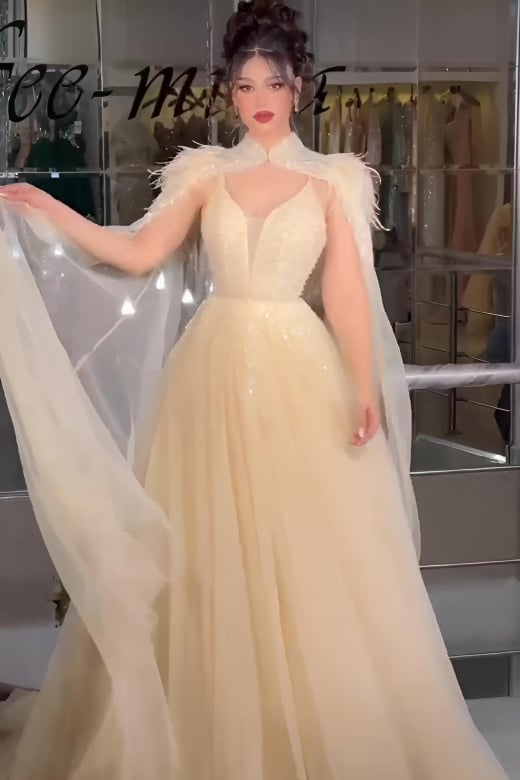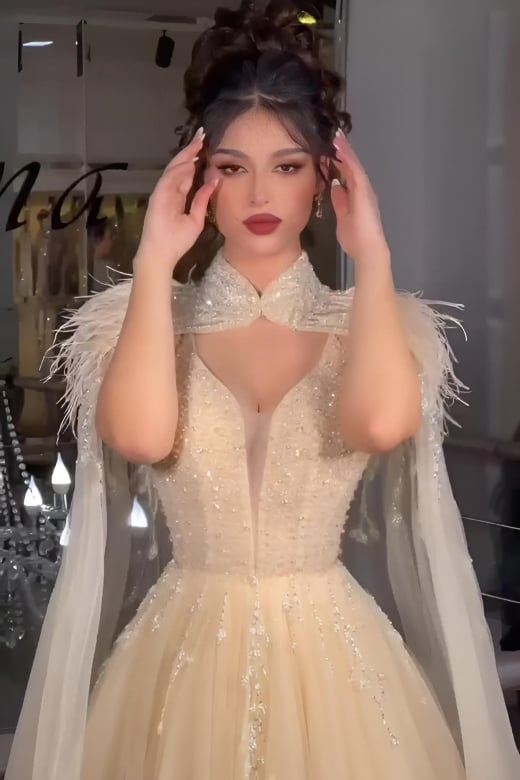 فستان سهرة بيج ذهبي بتصميم مبتكر - موديل غموض الذهب
