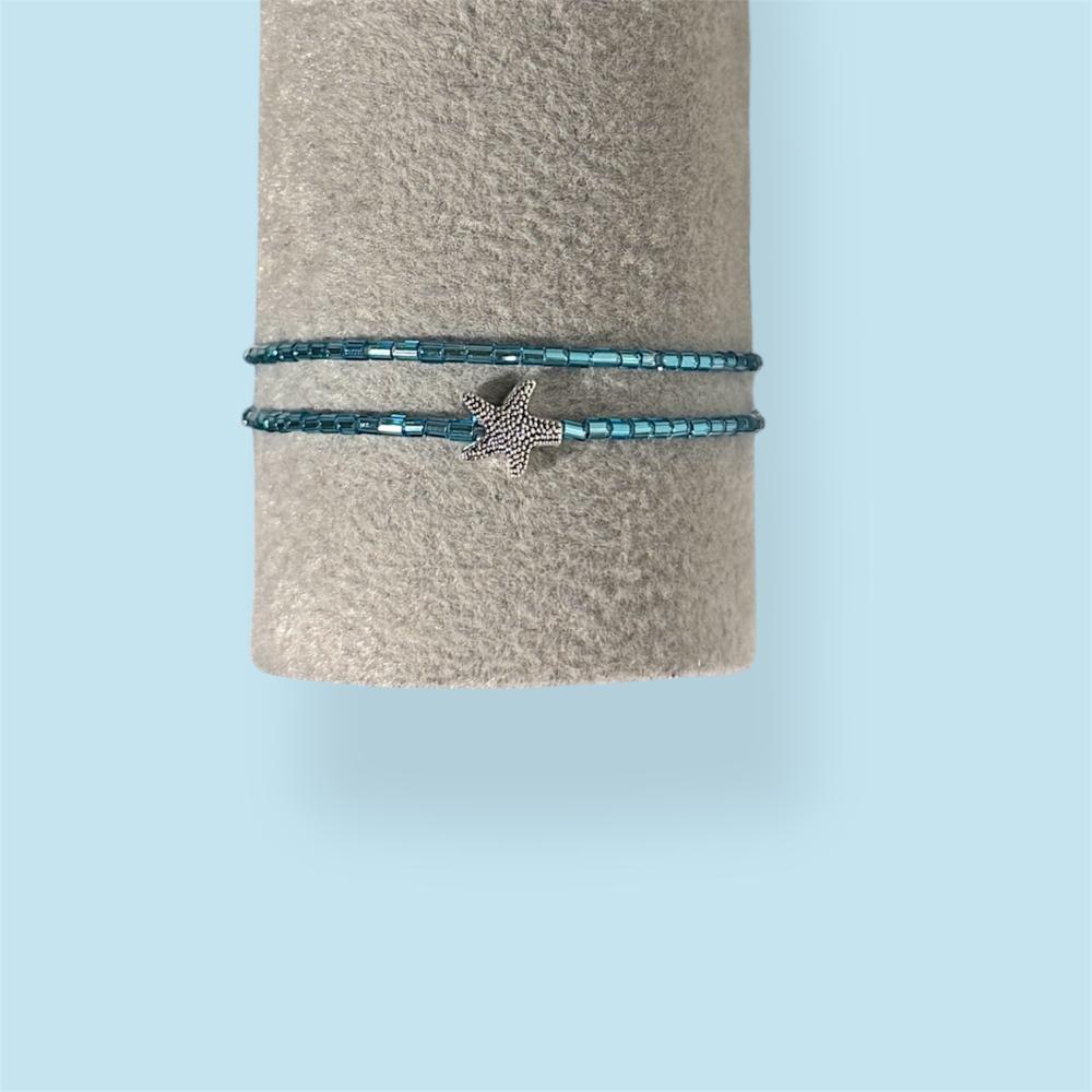 سوار أنيق مصنوع من خرز أزرق لامع بلمسة بحرية، يتوسطه تعليقة نجم بحر فضية تضيف له طابعاً مميزاً وعصرياً.