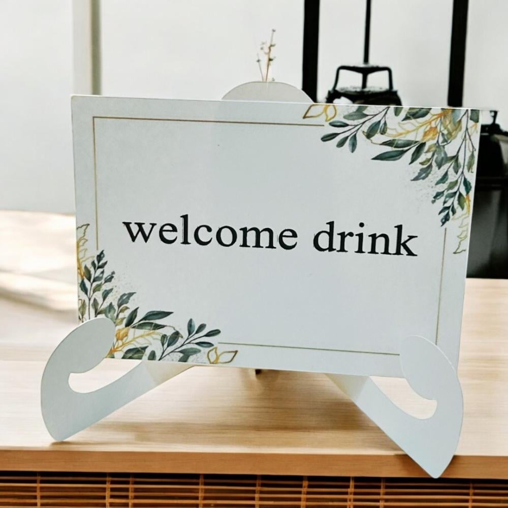 الوصف: 6 بطاقات ضيافة بتصميم "Welcome Drink" مع قاعدة ورقية، تضيف لمسة من الفخامة والتميز لضيافتك.