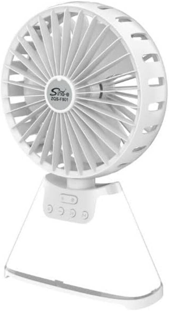 مروحة محمولة قابلة لإعادة الشحن مقاس 8 بوصات مع مشغل صوتي (طراز TK5313) تجمع بين مروحة ومكبر صوت بلوتوث وميزات الكاريوكي في جهاز واحد صغير الحجم. مزودة بتقنية بلوتوث الإصدار 5.0، وUSB، وسماعات لاسلكية حقيقية، ودعم بطاقة TF، وإضاءة غامرة، توفر خيارات صوتية متعددة وتأثير إضاءة ساطعة. تعمل ببطارية 18650 3.7 فولت/4000 مللي أمبير/ساعة، وتبلغ قدرتها 5 واط، وتستغرق إعادة شحنها من 3 إلى 4 ساعات. بمجرد شحنها بالكامل، توفر من 2 إلى 3 ساعات من التشغيل المتواصل. كما تتميز بشحن من النوع C لمزيد من الراحة، مما يجعلها مثالية للتبريد والترفيه أثناء التنقل