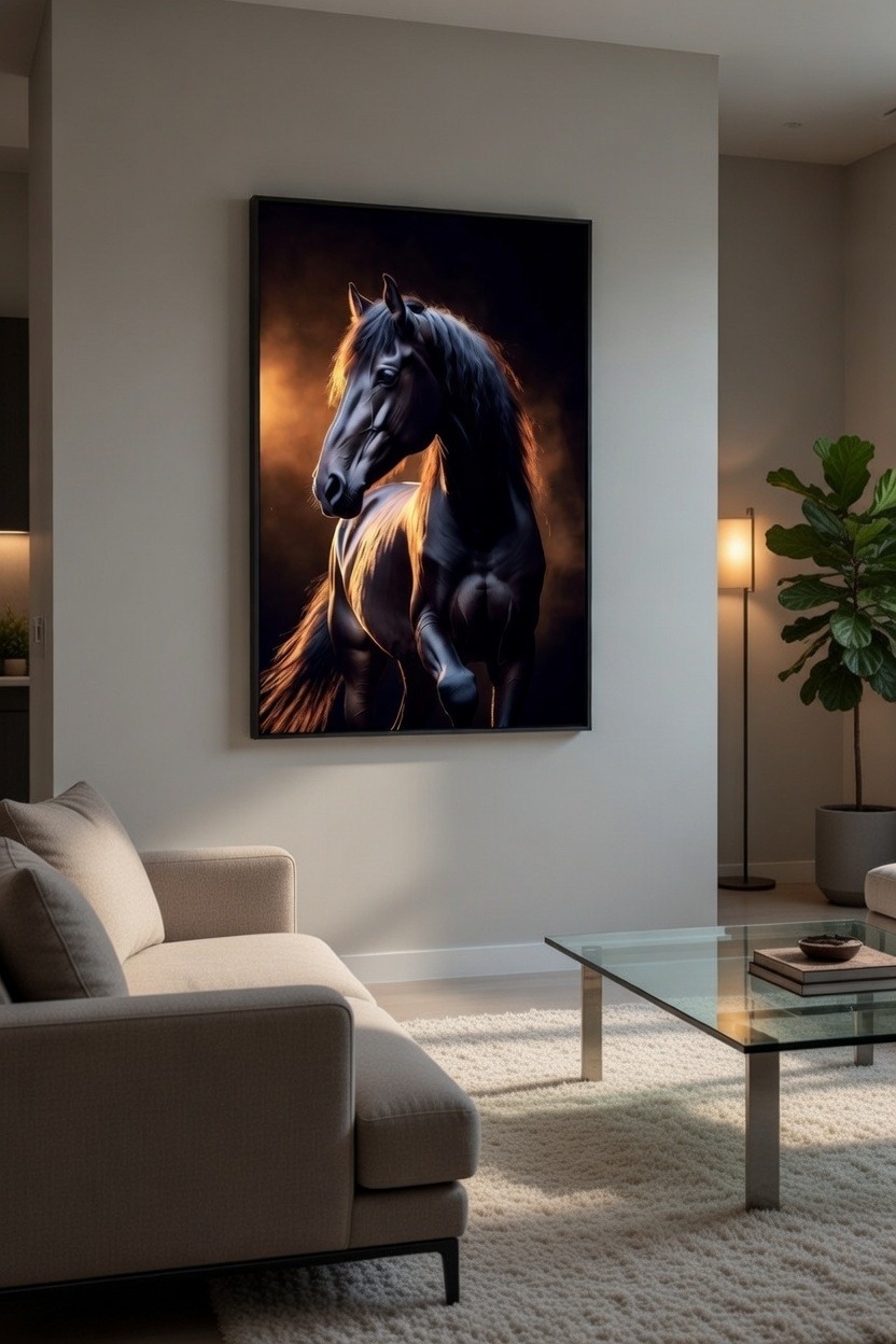 لوحة فنية مبهرة لحصان أسود بإضاءة ذهبية درامية تبرز تفاصيله بقوة وأناقة، تعكس الفخامة والهيبة في مشهد بصري آسر—قطعة مثالية لإضفاء حضور راقٍ وجذاب على أي مساحة