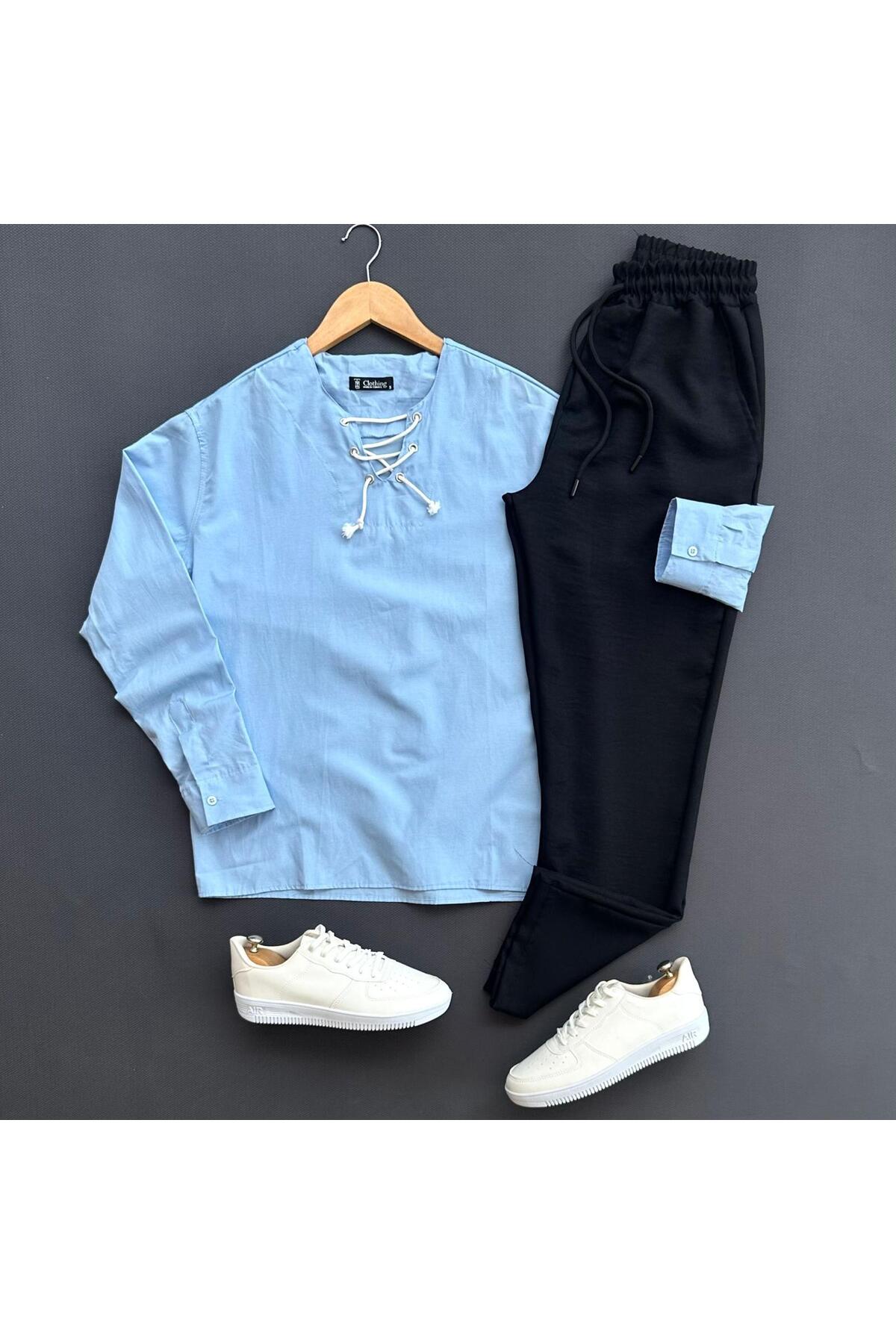 طقم بنطلون قميص كتان برباط للرجال مكون من قطعتين