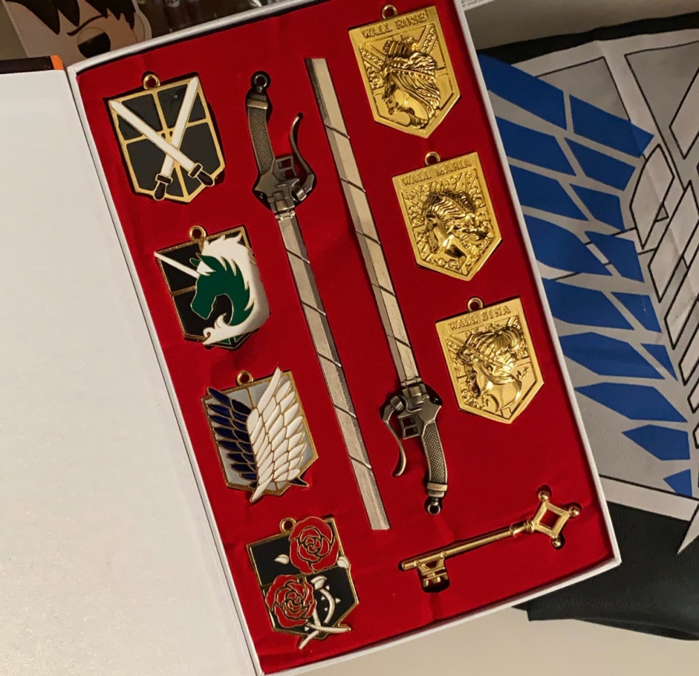 مجموعة هجوم العمالقة المميزة 💗تتكون من• 4 تعليقات للفرق• 3 تعليقات للجدران• سيفين• مفتاح القبو• سلسال وميدالية للتركيب