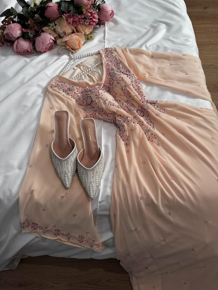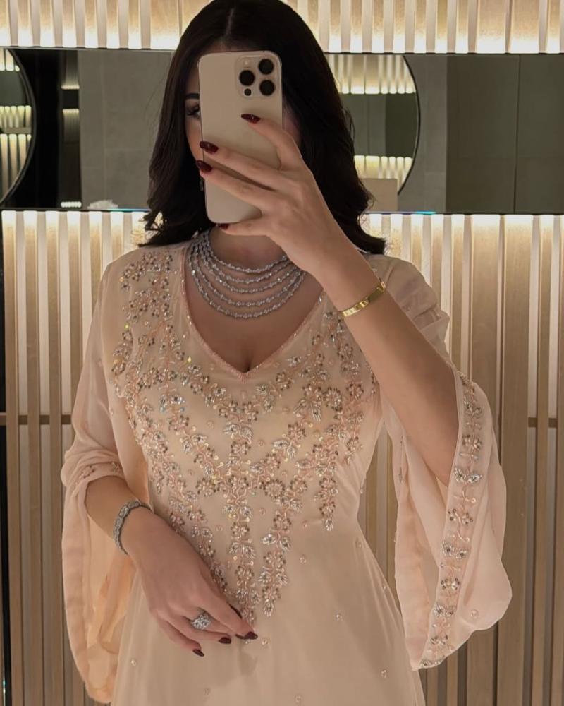 ✨ فستان أنيق بلون بيج راقٍ، يتميز بتطريز فاخر ولمسات براقة تضفي عليه لمسة من الفخامة والجاذبية. صُمم بأكمام واسعة لإطلالة أنثوية راقية، مع قَصّة مريحة تناسب مختلف المناسبات الفاخرة.