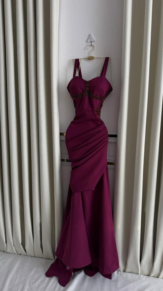 يتميّز الفستان بلونه البنفسجي الغني وتطريز فاخر بحبيبات الكريستال اللامعة على الصدر والخصر لإضافة لمسة من البريق والرقي.