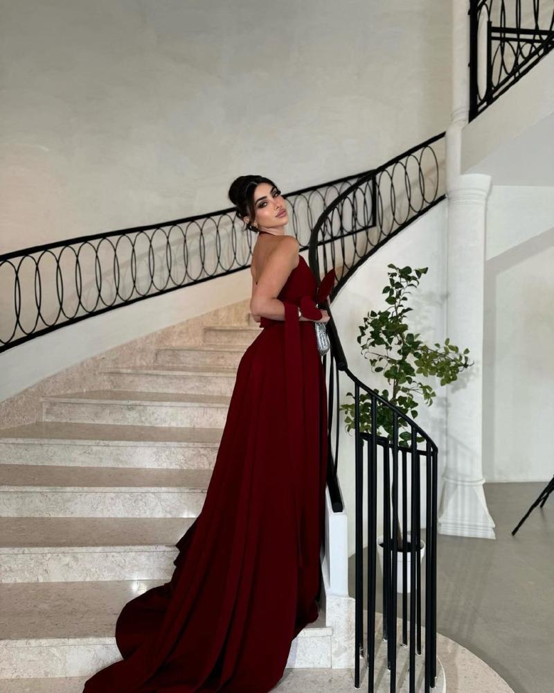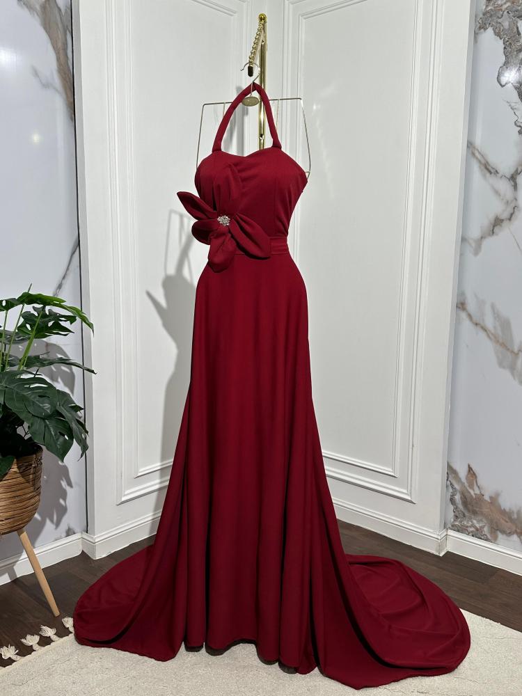 فستان انيق باللون الأحمر الداكن (العنابي) يتميز بتصميم أنيق وجذاب. الفستان طويل ومزين بذيل ممتد يعطيه طابعًا فاخرًا ومميزًا. يتميز بقصة صدر ضيقة مع حمالات أنيقة، مزينة بوردة بارزة كبيرة على الخصر، مما يضيف لمسة أنثوية راقية. القماش المستخدم يبدو ناعمًا وانسيابيًا، مما يمنح الفستان مظهرًا فخمًا وعصريًا. التصميم مناسب للسهرات والمناسبات الرسمية، ويعكس ذوقًا عاليًا وأناقة لا تُضاهى.