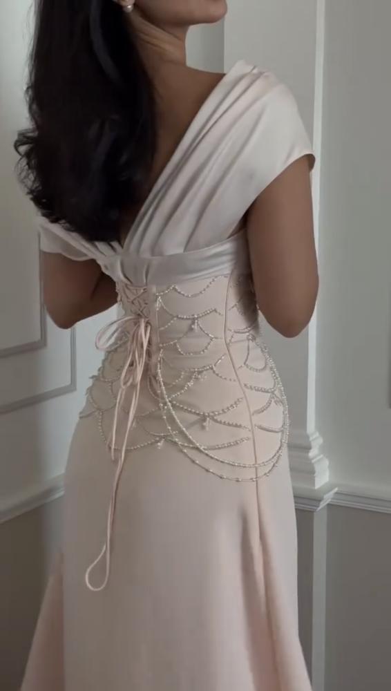 - الظهر: مفتوح مزين بسلاسل لؤلؤية وشرائط قابلة للتعديل