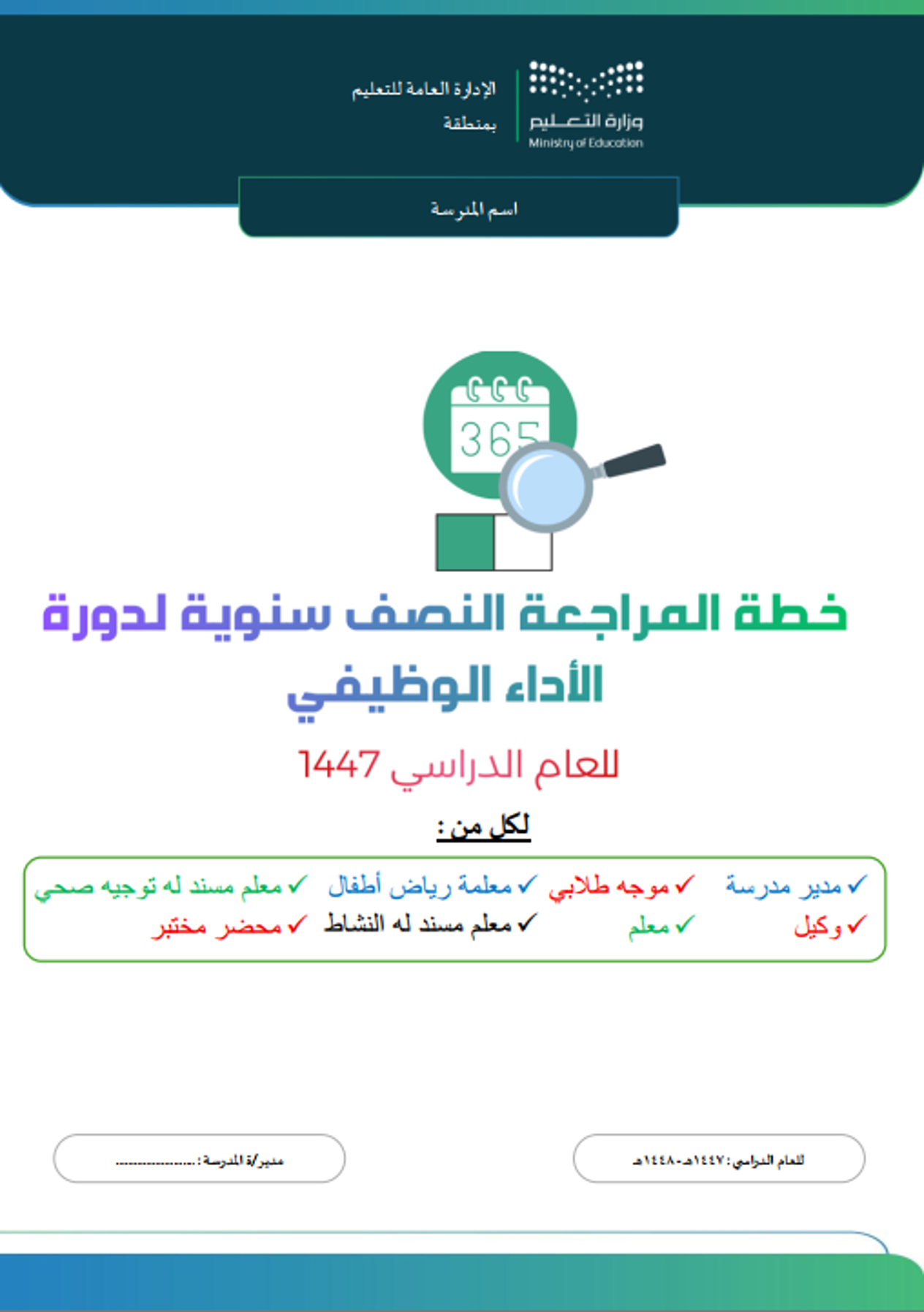 - لأن تطوير الأداء الوظيفي لم يعد خيارًا بل ضرورة، يأتي سجل المراجعة نصف السنوية لدورة الأداء الوظيفي كأداة احترافية تمكّنك من متابعة الأداء بدقة، وتحليل الفجوات بوضوح، وتحويل التقييم من إجراء روتيني إلى فرصة حقيقية للتحسين والنمو. هذا السجل صُمم ليخفف عنك عبء العشوائية، وينهي التقديرات غير المبنية على شواهد، ويمنحك إطارًا منظمًا يدعم اتخاذ القرار، ويعزز العدالة والشفافية، ويربط الأداء مباشرة بتحسين نواتج التعلم وجودة الممارسات التعليمية، ليكون دليلك العملي نحو أداء مؤسسي متقن يواكب تطلعات منظومة التعليم.