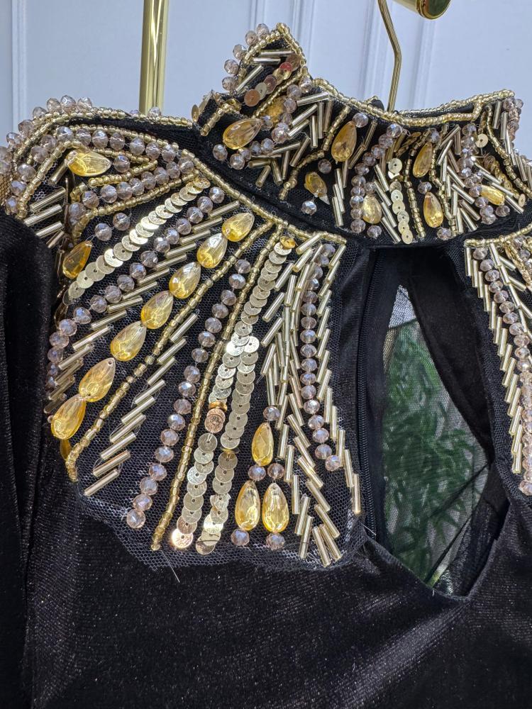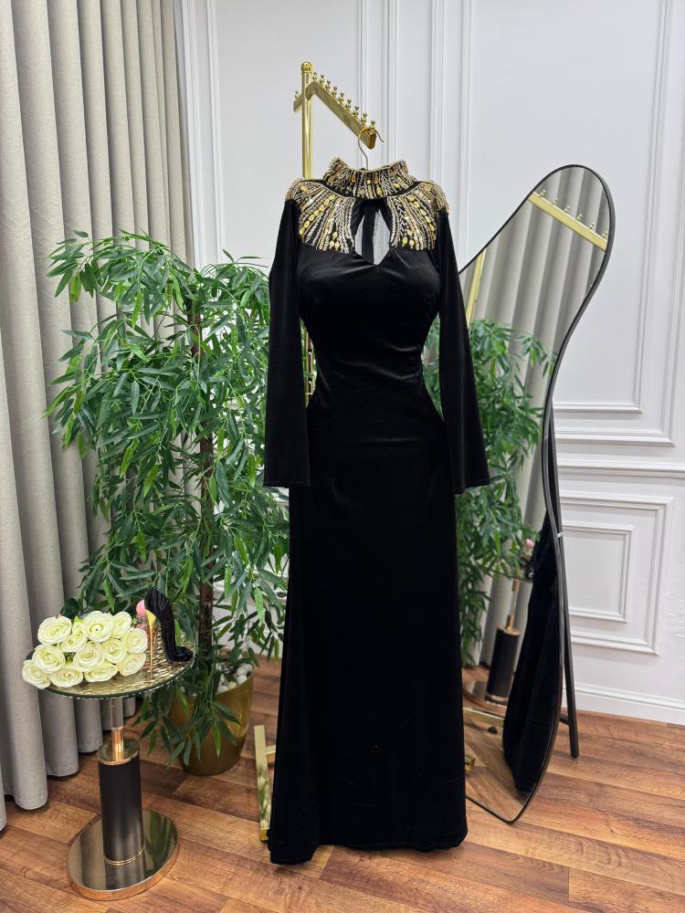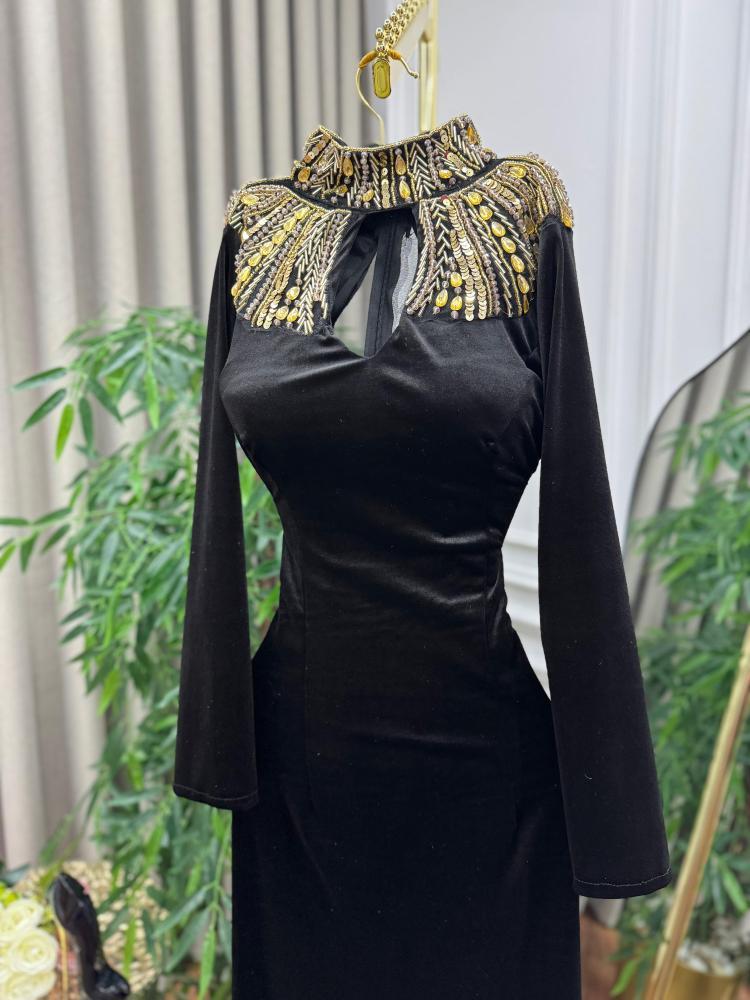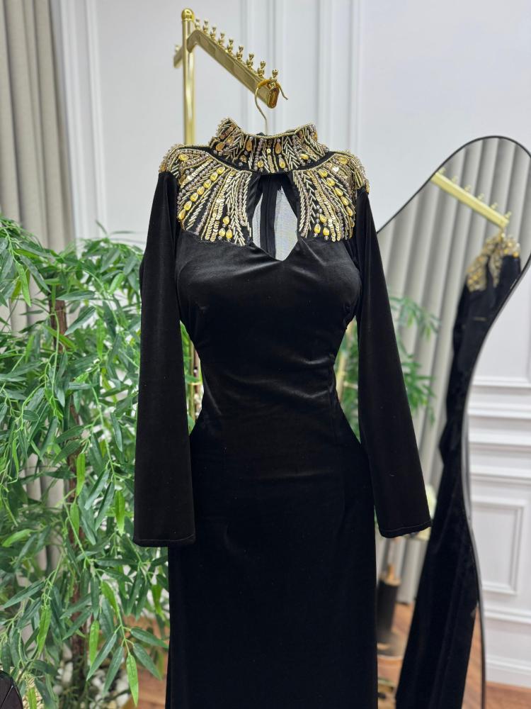 - اسم المنتج: فساتين اسود مخمل مع تل وتطريز يدوي