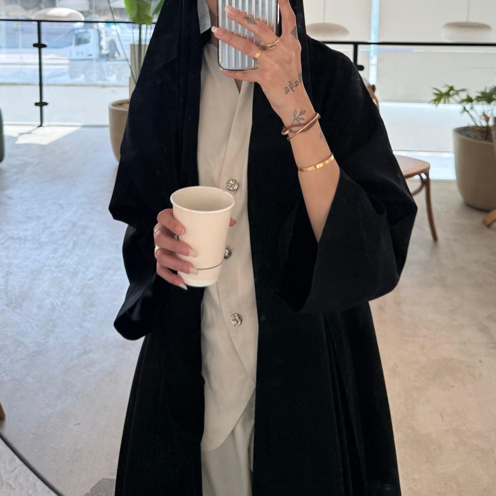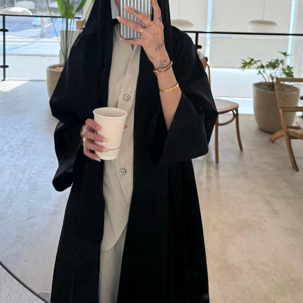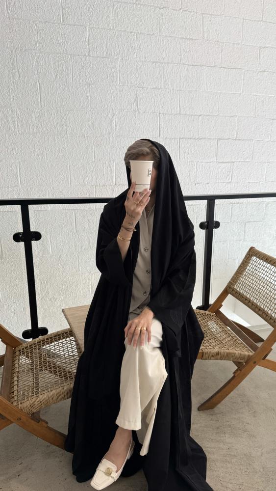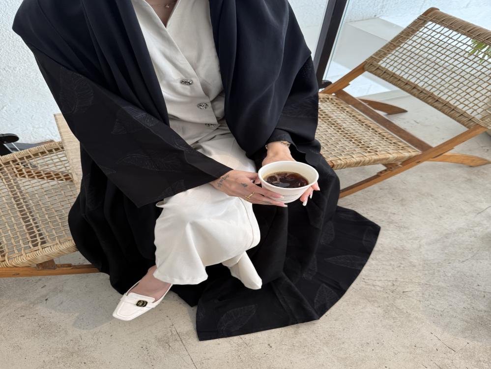 عباية أنيقة باللون الأسود الكلاسيكي، القماش جاكار مشجر ،بتفاصيل نقشات أوراق ناعمة مدمجة في القماش بشكل أنثوي وراقي.