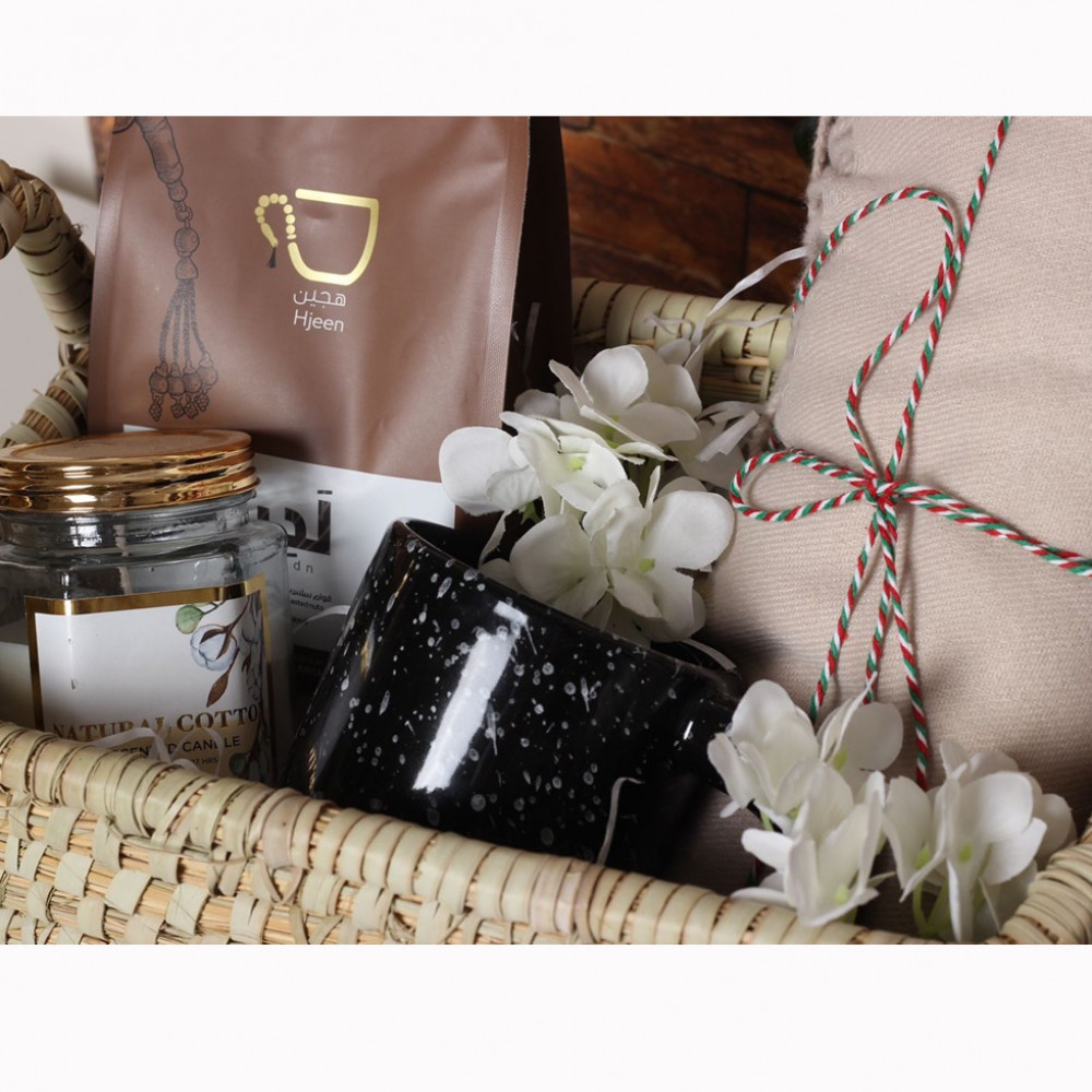 سلة خوص ريفيه تحتوي على /قهوة هجين 250 جرام .سكارف لون بيج .كوب أسود بنقشات .شمعة معطره .كارد حسب الطلب .شامل تغليف سولفان .