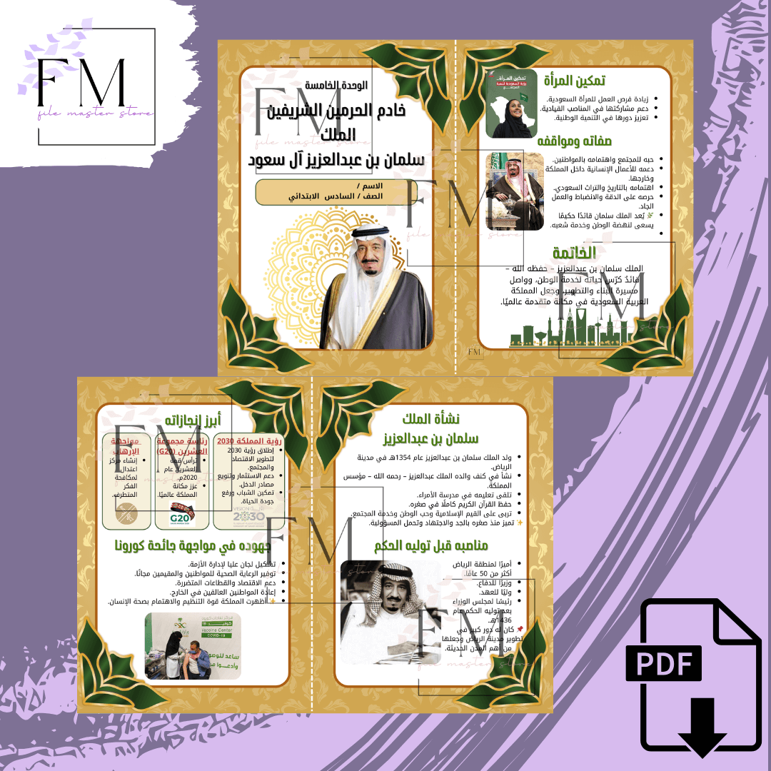مطوية اجتماعيات سادس الترم الثاني - الوحدة الخامسة خادم الحرمين الشريفين الملك سلمان بن عبد العزيز آل سعود حفظه الله