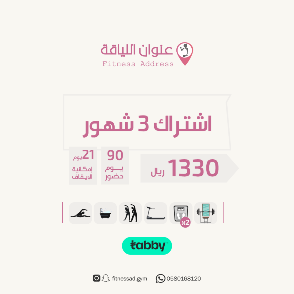 الاشتراك شامل جميع مرافق النادي مسبح (للسباحة الحره فقط) ، جاكوزي ، بخار ، أجهزة حديد ، وأجهزة كارديو وكلاسات مع المدربات.