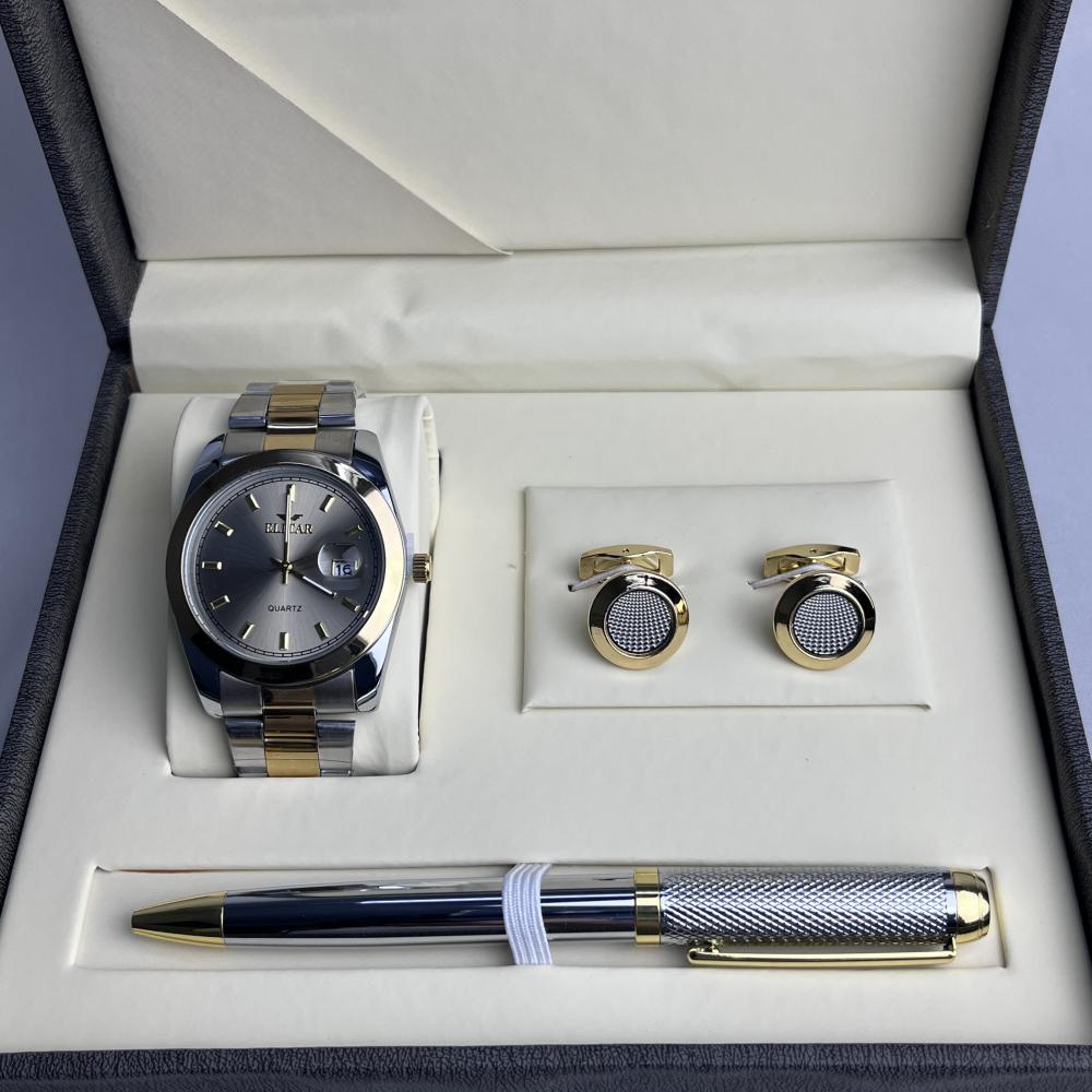 يحتوي الطقم على قلم أنيق من المعدن بلون ذهبي ويعد القلم جزء لا يتجزأ من هذا الطقم, فهو يعكس الطموح وحب العمل والإنجاز لديك