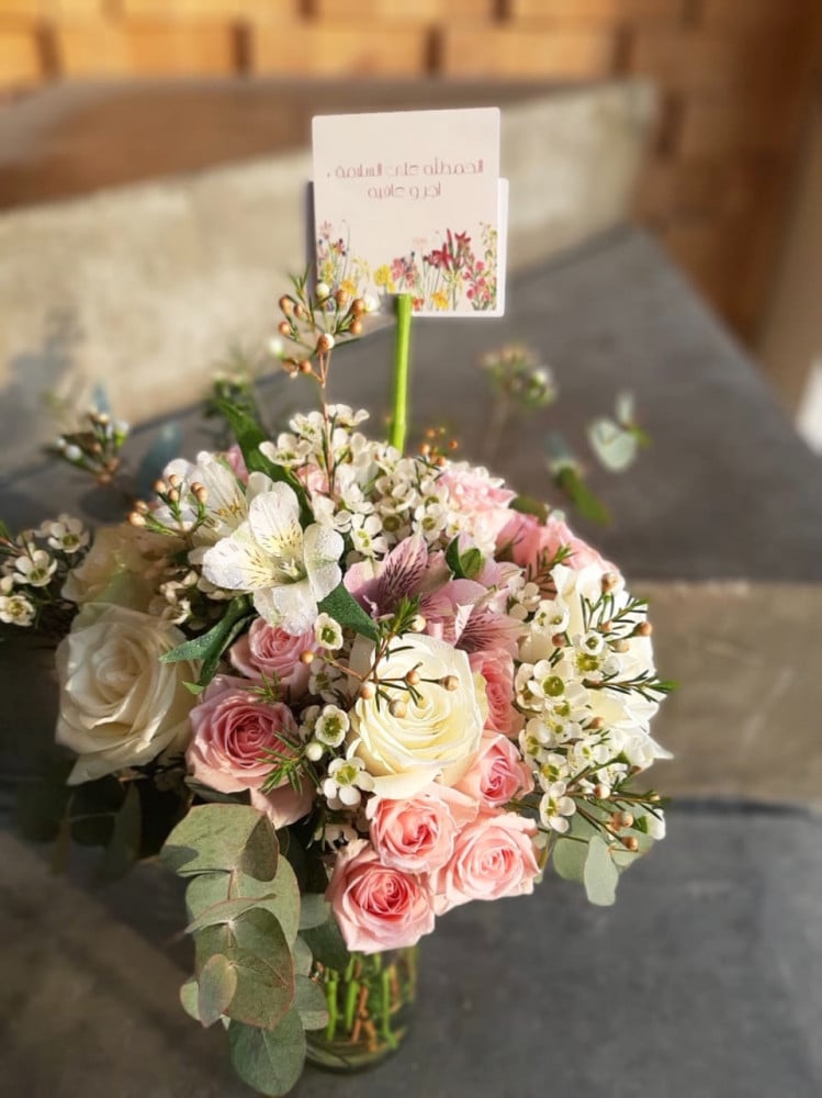فازة طولية زجاجية ، مع خليط الزهور الهولندي الفاخر