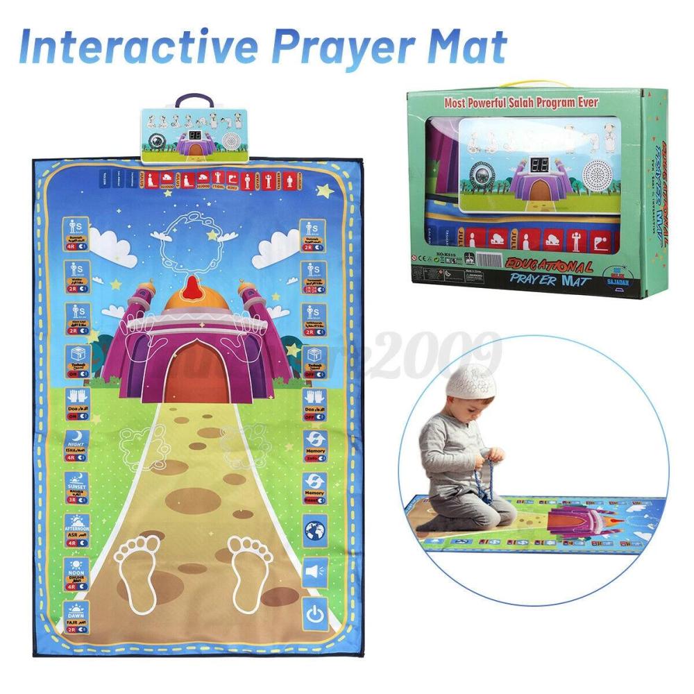 سجادة صلاة مصممة لتعليم وتعليم الأطفال كيفية أداء الصلاة خطوة بخطوة بطريقة ممتعة وسهلة وتفاعلية. يدعم 10 لغات ناطقة: الإنجليزية والعربية والفرنسية والماليزية والإندونيسية والأردية والروسية والأوزبكية والتركية والكردية. تتفاعل سجادة الصلاة مع اللمس وتحتوي على مفاتيح قابلة للمس للكشف عن الصوت، مثل الأذان وأوقات الصلاة وتلاوة السور والدعاء والمزيد.