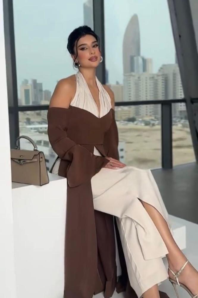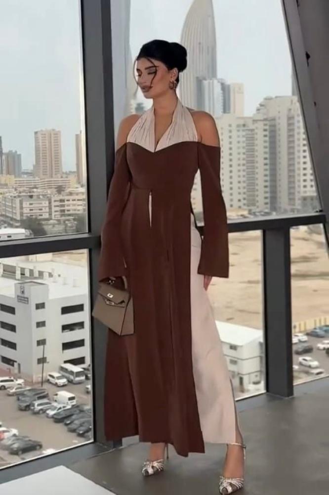الجمبسوت في الصورة يتميز بتصميم عصري وأنيق يجمع بين الألوان الترابية الراقية. يأتي بقصة تجمع بين الأناقة والجرأة، حيث يتميز بأكمام طويلة منسدلة مع فتحة عند الأكتاف تمنح لمسة أنثوية جذابة. الجزء العلوي بتصميم مكشوف الأكتاف (Off-Shoulder) مع ياقة ملتفة حول العنق باللون البيج، مما يضيف تباينًا أنيقًا مع اللون البني الغامق للجمبسوت.
