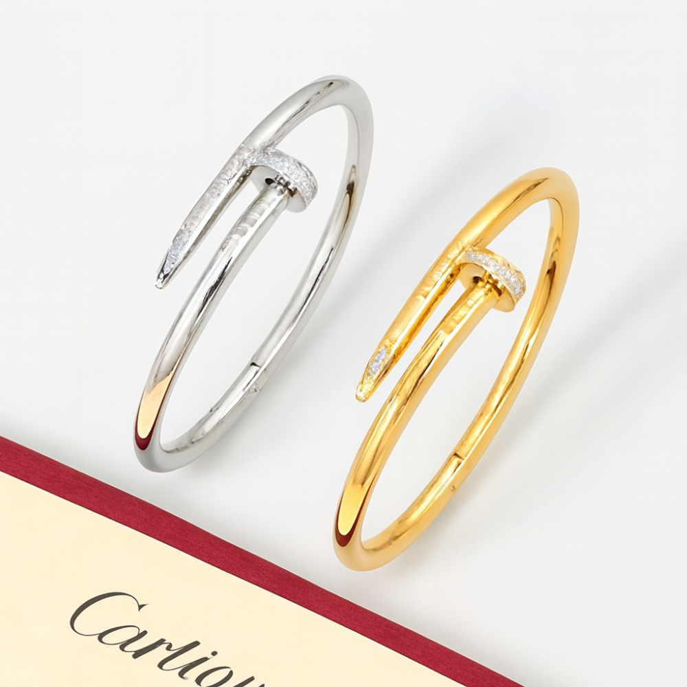ارتقِ بإطلالتك مع سوار Cartier Juste un Clou الأيقوني، المصمم بشكل مسمار منحني يعكس روح التمرد والفخامة في آنٍ واحد. يأتي هذا التصميم الفريد بخيارين فاخرين: سوار من الذهب الأبيض وآخر من الذهب الأصفر، وكلاهما مرصع بألماس برّاق على رأس المسمار ليضفي لمسة من التألق والرقي.