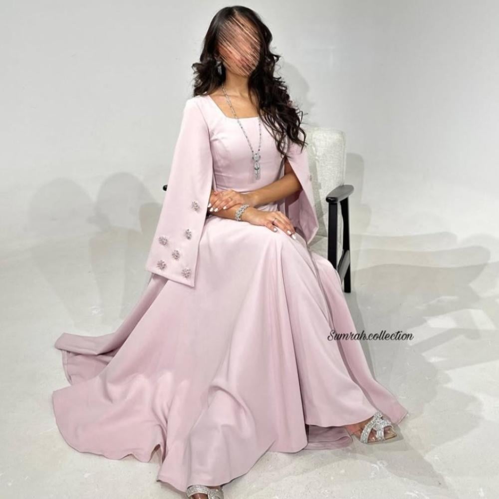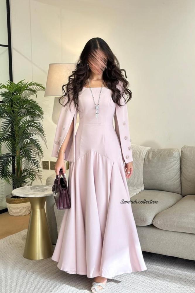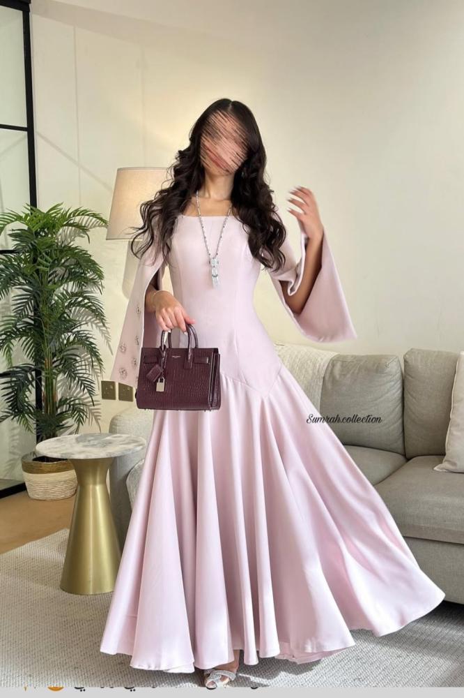 فستان طويل وأنيق، مصنوع من قماش لامع بلون وردي فاتح. الجزء العلوي من الفستان ضيق ويبرز جمال الخصر، بينما الجزء السفلي يتسع قليلاً وينسدل بشكل جميل على الأرض. الفستان مزين بتطريزات دقيقة ولامعة تضيف لمسة من الفخامة والرقي. تصميم الفستان يعكس الأنوثة والجاذبية بشكل رائع.