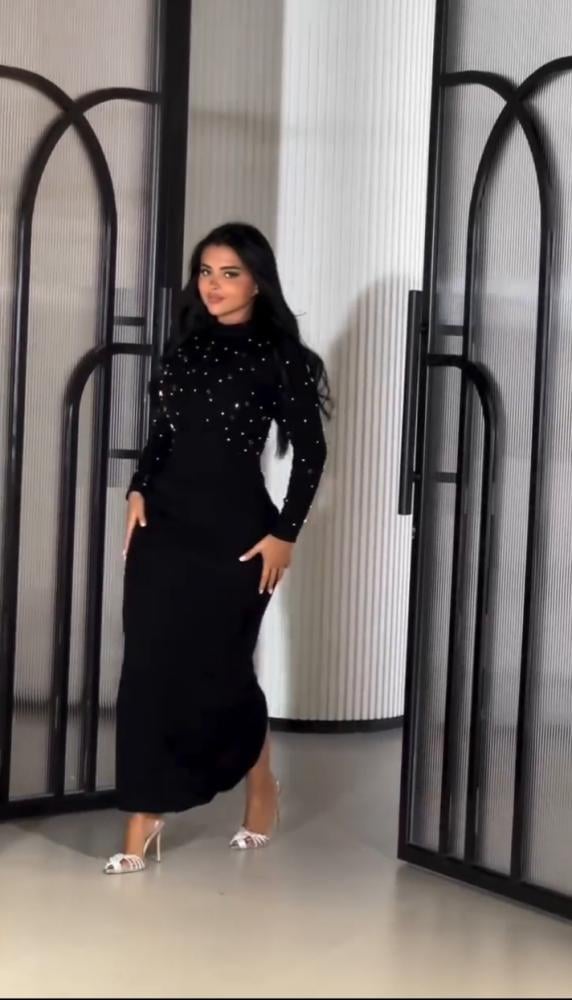 فستان طويل وأنيق، مصنوع من قماش لامع بلون وردي فاتح. الجزء العلوي من الفستان ضيق ويبرز جمال الخصر، بينما الجزء السفلي يتسع قليلاً وينسدل بشكل جميل على الأرض. الفستان مزين بتطريزات دقيقة ولامعة تضيف لمسة من الفخامة والرقي. تصميم الفستان يعكس الأنوثة والجاذبية بشكل رائع.