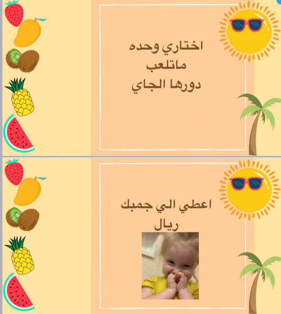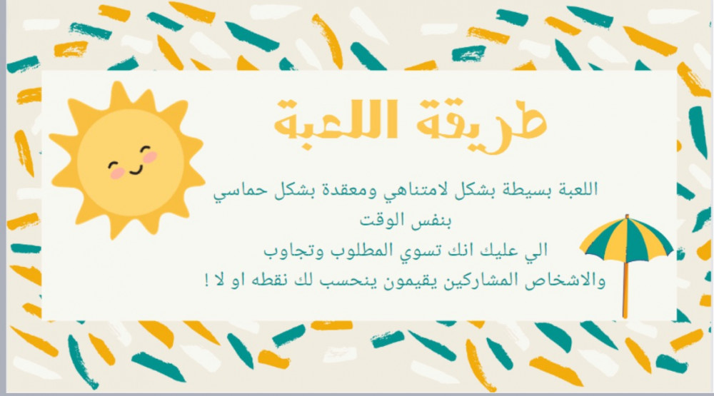 عرض بوربوينت تفاعلي يحتوي على اكثر من 100 شريحة (مابين تحديات ، اساله ، احزر الكلمه، امثال ) شرائح انيقة بتصميم خاص للصيف تحتوي على فعاليات شيقة ومتنوعة مليئه بالضحك والفعاليات لنصنع البهجة والفرحه في جمعاتكم السعيدة 🍉☀️