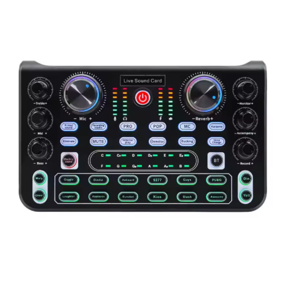 - لوحة تحكم ذكية: مقابض دائرية كبيرة للتحكم الفوري في مستوى صوت الميكروفون والصدى (Reverb) لضمان أفضل تجربة استماع.