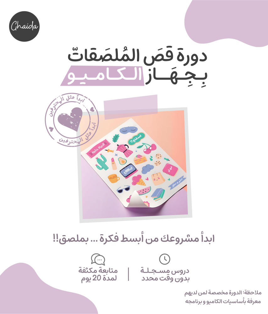 في هذه الدورة المتخصصة، ستتعلم/ين خطوات تصميم وقص الملصقات باستخدام جهاز الكاميو باحتراف، من الإعداد إلى التنفيذ. الدورة موجهة لمن لديهم معرفة مسبقة بأساسيات الجهاز وبرنامج التصميم المستخدم معه، ويرغبون بتطوير مهاراتهم وتحويل أفكارهم إلى منتجات ملموسة وجاهزة للبيع أو الاستخدام الشخصي.
