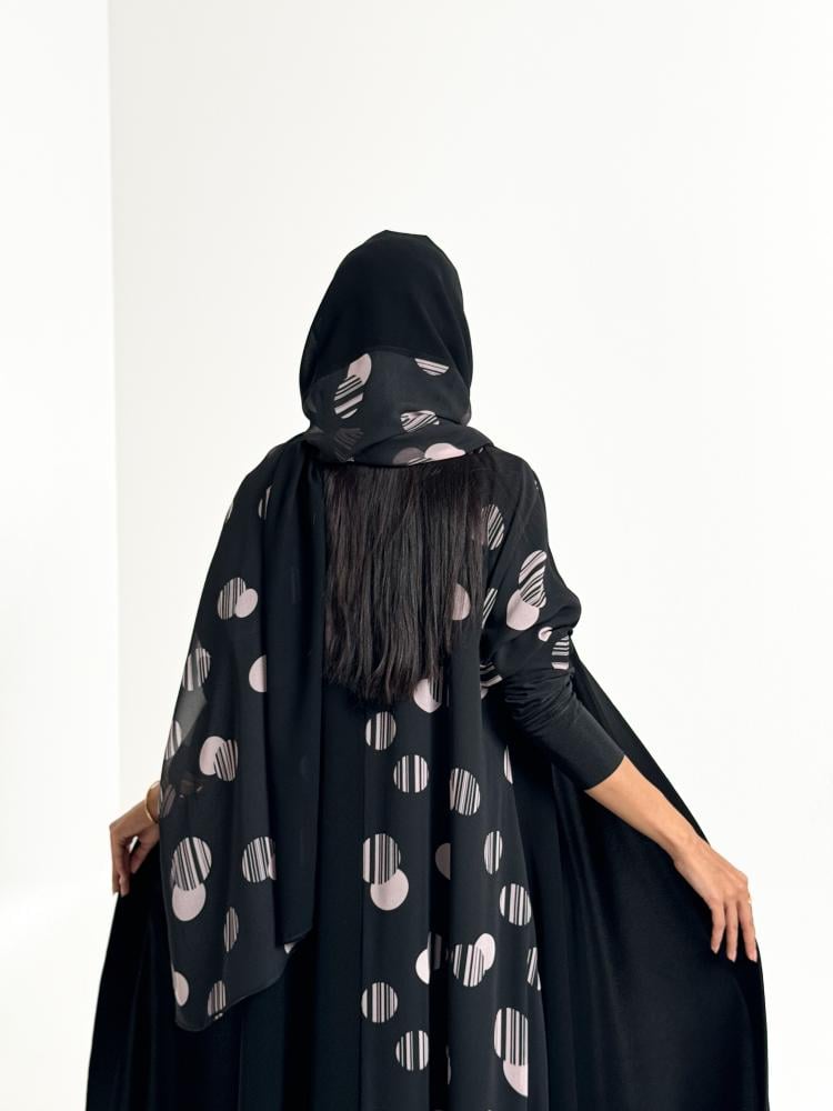 التفاصيل : قماش كريب اندنوسي وشيفون ، قصة A ، طرحة نص اسود ونص شيفون