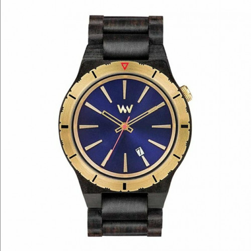 ساعة رجالية بالخشب الغامق مع إطار من الستيل الذهبي ومينا أزرق مع ميزة التاريخ