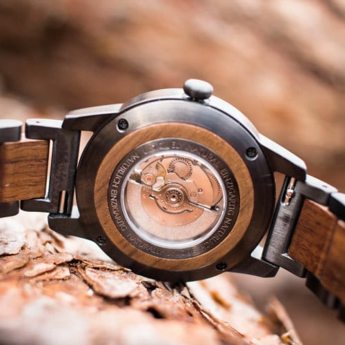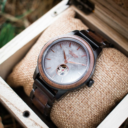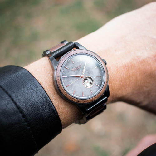 ساعة بخشب الجوز مع ستيل رمادي غامق ومينا رخام