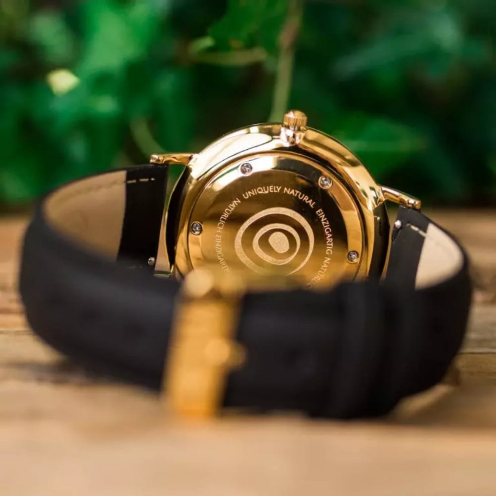 خشب غامق مع ستيل ذهبي وجلد أسود