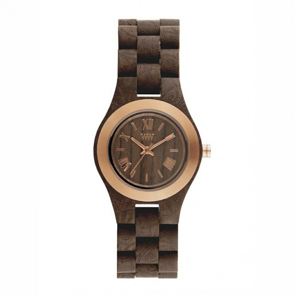 ساعة نسائية بالخشب الغامق المنقوش مع إطار بلون الروز قولد